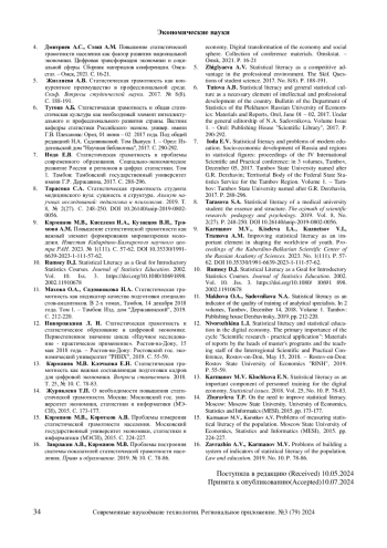 16. Завражин А.В., Карманов М.В. Проблемы построения системы показателей статистической грамотности населения. Право и образование. 2019. № 10. С. 78-86. EDN: EZDXEJ