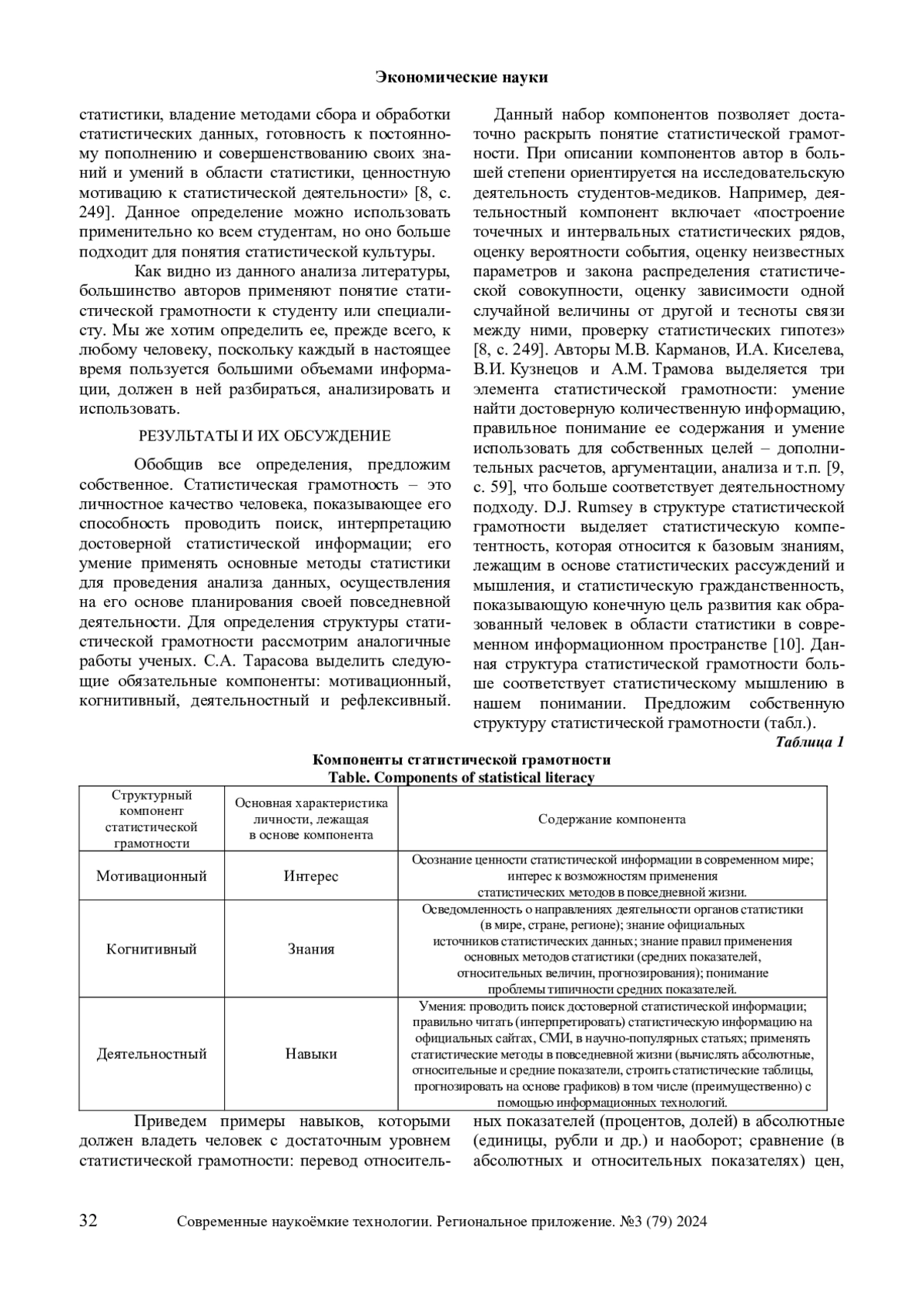 В статье представлены результаты исследования понятия статистическая грамотность и его различие с понятиями статистической культурой и статистическим мышлением. На основании анализа литературы определены основные подходы к определению статистической грамотности: как прикладной дисциплины, как уровня (составляющей) статистической культуры специалиста и как профессиональное качество специалиста. Предложено авторское определение статистической грамотности применительно к широкому кругу населения. Разработаны структурные элементы статистической грамотности личности, к которым относятся: мотивационный, когнитивный и деятельностный компоненты. Для каждого компонента определена основная характеристика личности, лежащая в его основе. Дано описание компонентов статистической грамотности. Для деятельностного компонента приведен пример навыков, которыми должен владеть человек с достаточным уровнем статистической грамотности. Определены перспективы исследования.