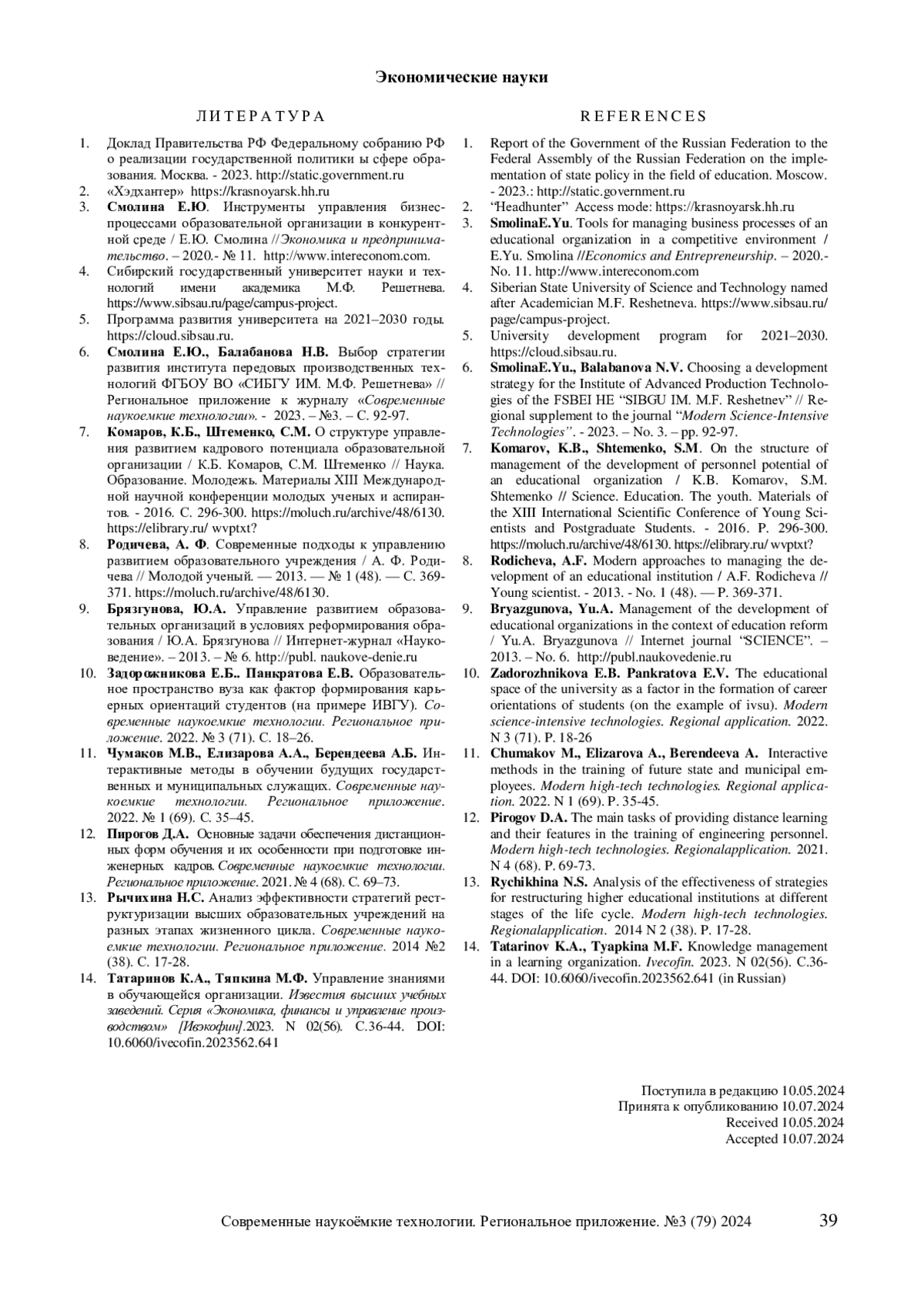 6. Смолина Е.Ю., Балабанова Н.В. Выбор стратегии развития института передовых производственных технологий ФГБОУ ВО “СИБГУ ИМ. М.Ф. Решетнева” // Региональное приложение к журналу “Современные наукоемкие технологии”. - 2023. - №3. - С. 92-97. EDN: VEKOSF