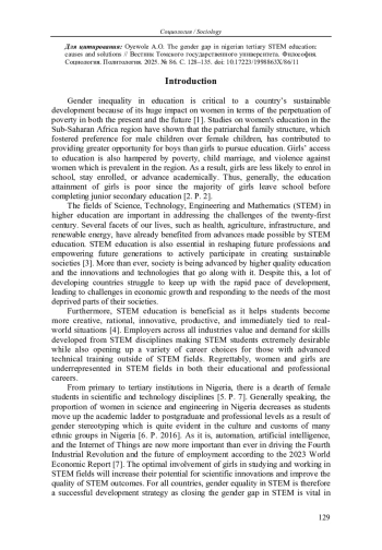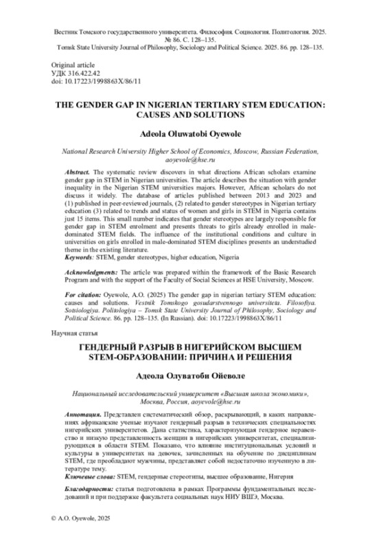 Представлен систематический обзор, раскрывающий, в каких направлениях африканские ученые изучают гендерный разрыв в технических специальностях нигерийских университетов. Дана статистика, характеризующая гендерное неравенство и низкую представленность женщин в нигерийских университетах, специализирующихся в области STEM. Показано, что влияние институциональных условий и культуры в университетах на девочек, зачисленных на обучение по дисциплинам STEM, где преобладают мужчины, представляет собой недостаточно изученную в литературе тему.