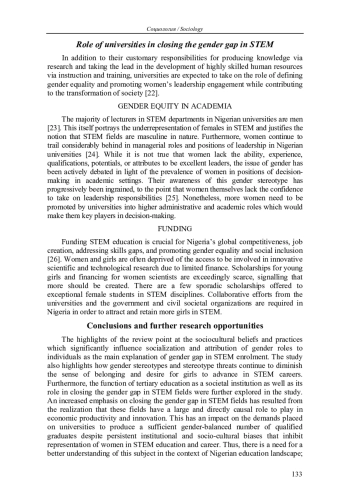 The systematic review discovers in what directions African scholars examine gender gap in STEM in Nigerian universities. The article describes the situation with gender inequality in the Nigerian STEM universities majors. However, African scholars do not discuss it widely. The database of articles published between 2013 and 2023 and (1) published in peer-reviewed journals, (2) related to gender stereotypes in Nigerian tertiary education (3) related to trends and status of women and girls in STEM in Nigeria contains just 15 items. This small number indicates that gender stereotypes are largely responsible for gender gap in STEM enrolment and presents threats to girls already enrolled in maledominated STEM fields. The influence of the institutional conditions and culture in universities on girls enrolled in male-dominated STEM disciplines presents an understudied theme in the existing literature.