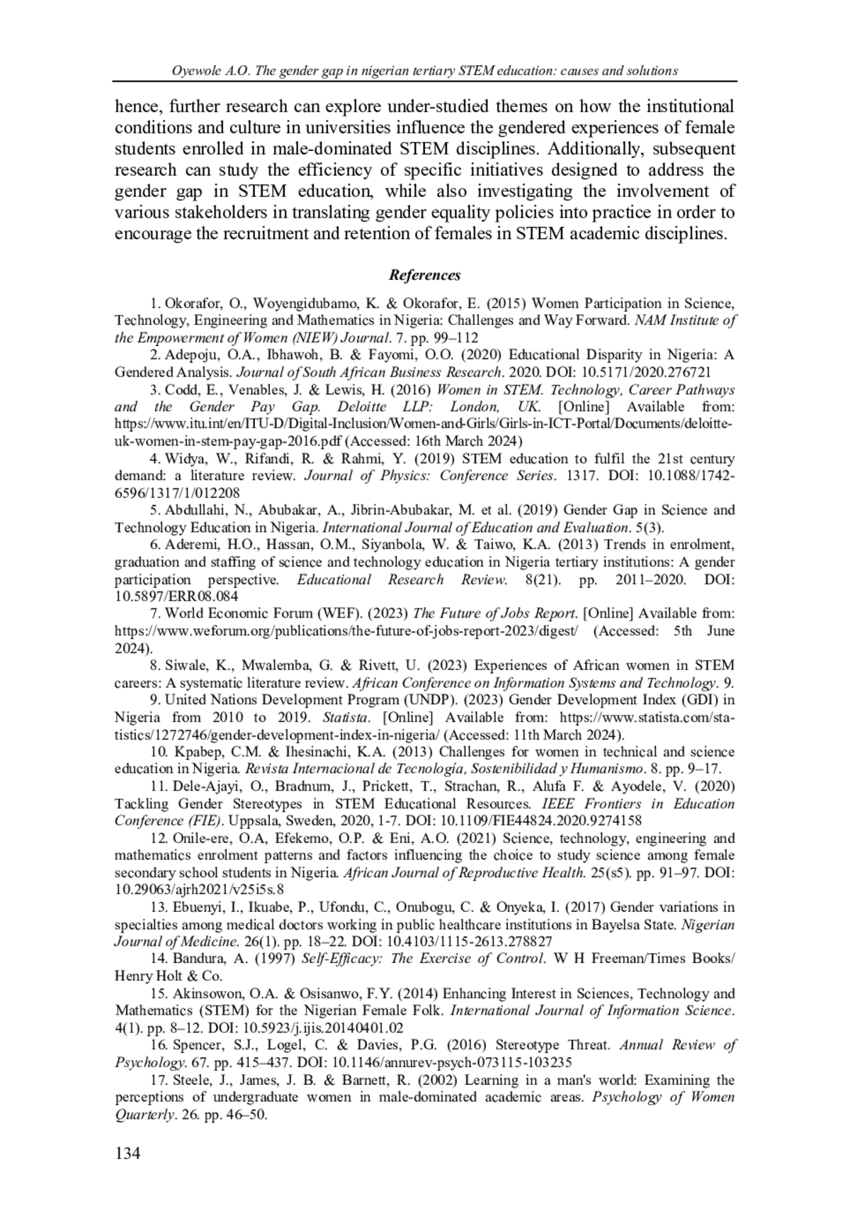 21. Eraikhuemen, L. & Oteze, I.K. (2015) An empirical study of the perception of undergraduates of Nigerian female participation in science, technology and mathematics. Journal of International Women’s Studies. 16(3). pp. 33-41.
