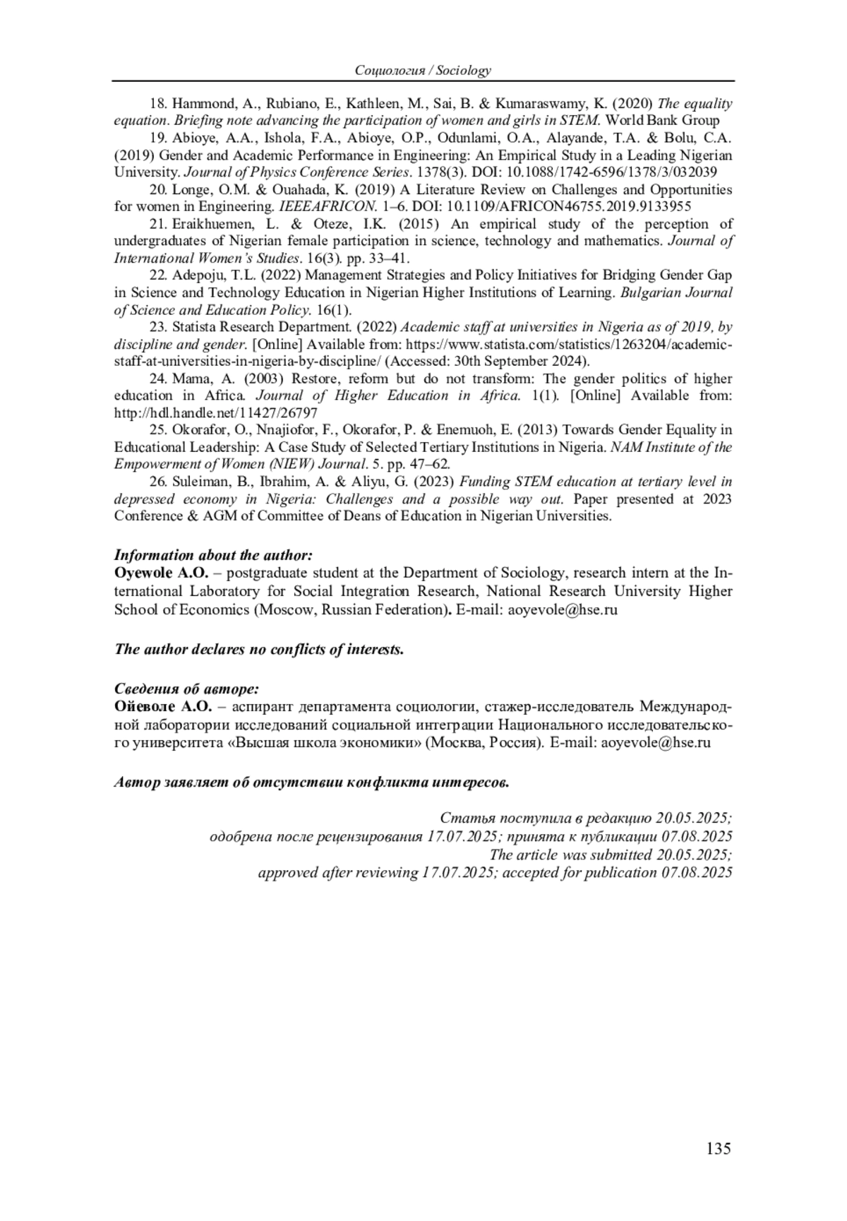 19. Abioye, A.A., Ishola, F.A., Abioye, O.P., Odunlami, O.A., Alayande, T.A. & Bolu, C.A. (2019) Gender and Academic Performance in Engineering: An Empirical Study in a Leading Nigerian University. Journal of Physics Conference Series. 1378(3). DOI: 10.1088/1742-6596/1378/3/032039