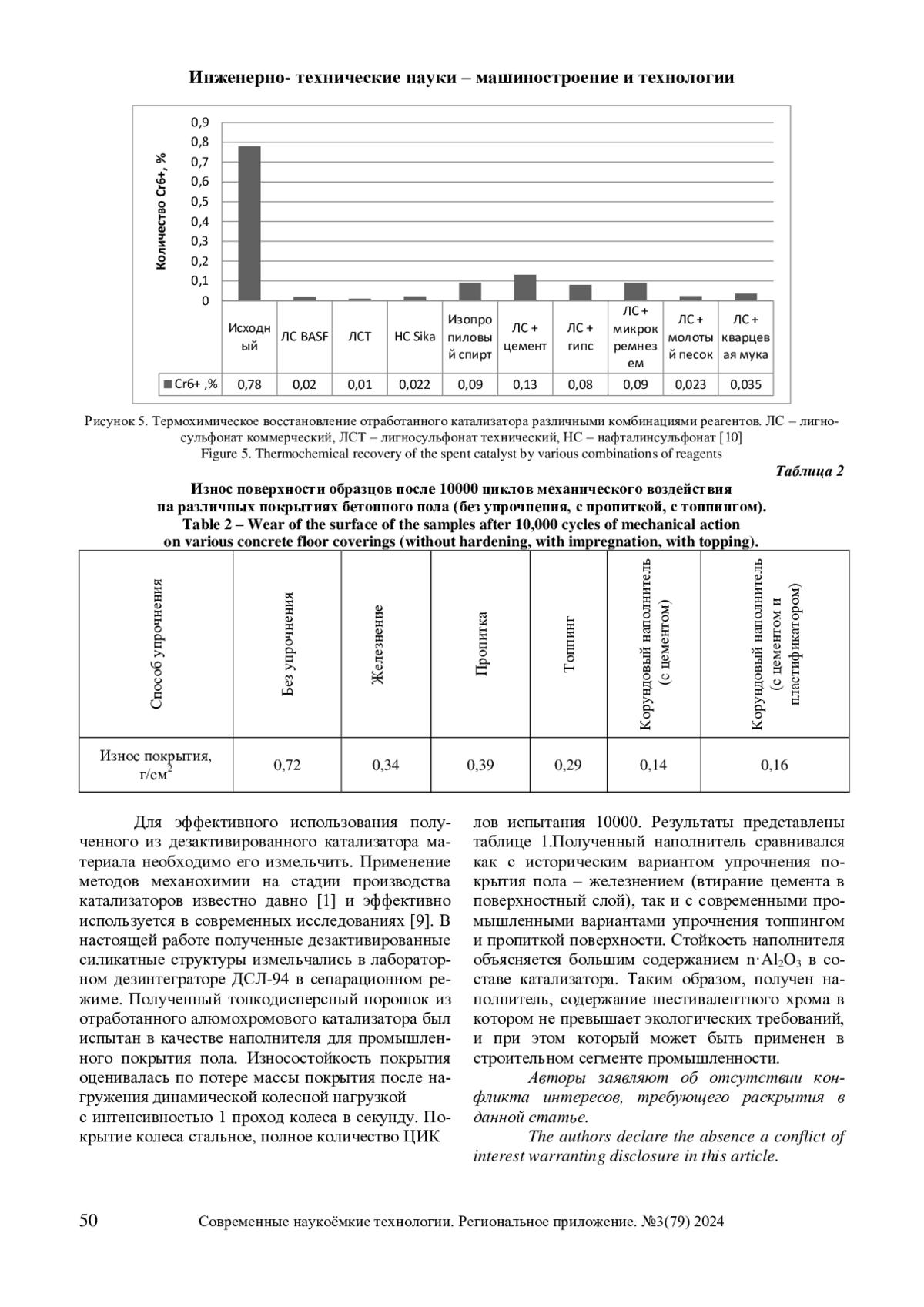В настоящей работе проанализированы существующие методы переработки отработанного алюмохромового катализатора. Показано, что использование некоторых восстановителей шестивалентного хрома может быть эффективно для переработки катализатора. В качестве восстановителей предложены технические лигно- и нафталинсульфонаты, используемые совместно с силикатным наполнителем. Полученные силикатные структуры в дальнейшем измельчаются в дезинтеграторе до получения однородного тонкодисперсного наполнителя. Этот наполнитель был испытан в качестве упрочнителя верхнего слоя для промышленных бетонных полов. Показано, что покрытие, в состав которого введен наполнитель из отработанного катализатора совместно с цементом, обладает лучшей стойкость к износу по сравнению даже с промышленными упрочнителями. По сравнению с неупрочненным покрытием стойкость возрастает более чем в 5 раз.