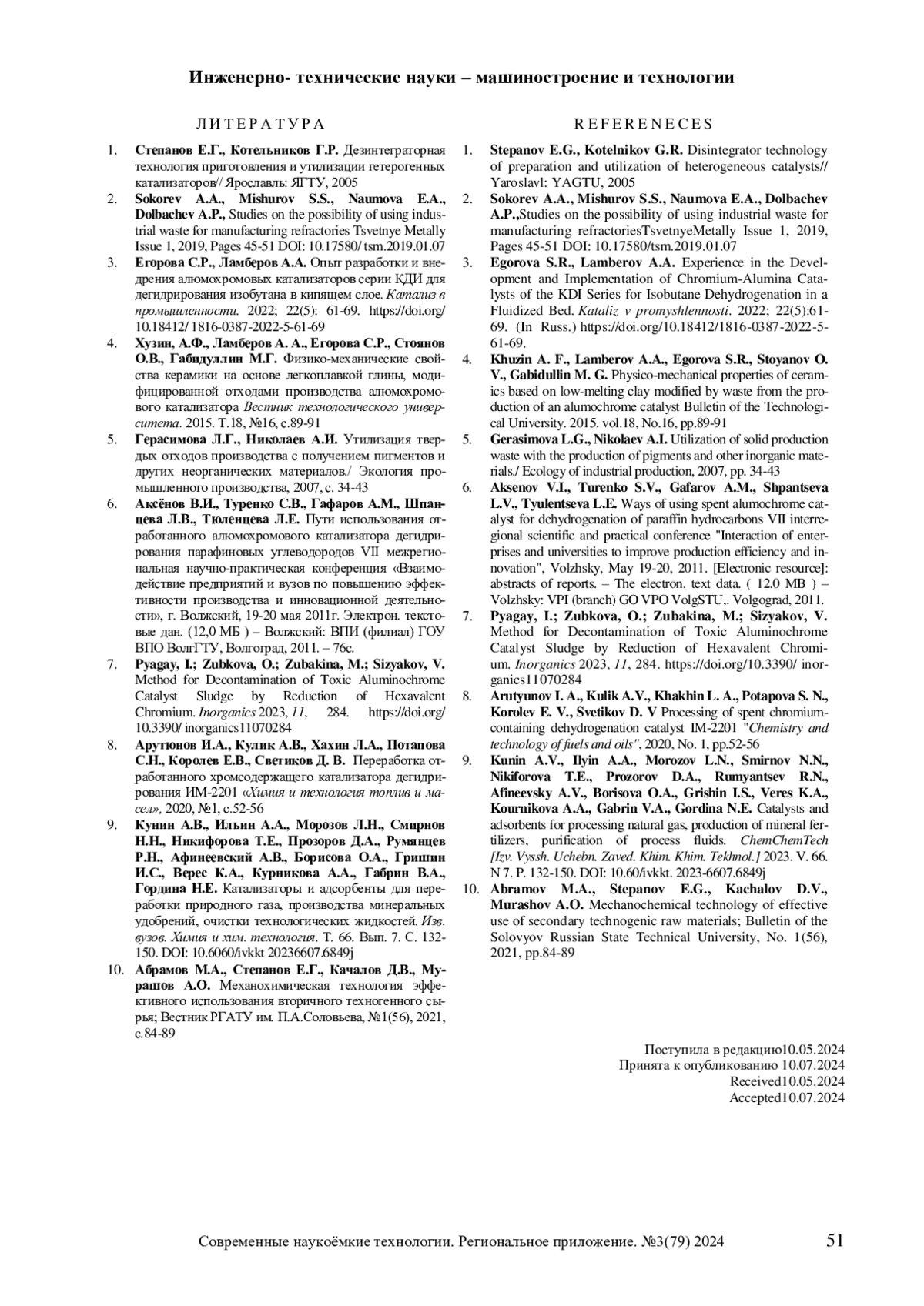 1. Степанов Е.Г., Котельников Г.Р. Дезинтеграторная технология приготовления и утилизации гетерогенных катализаторов// Ярославль: ЯГТУ, 2005. EDN: QNECRR