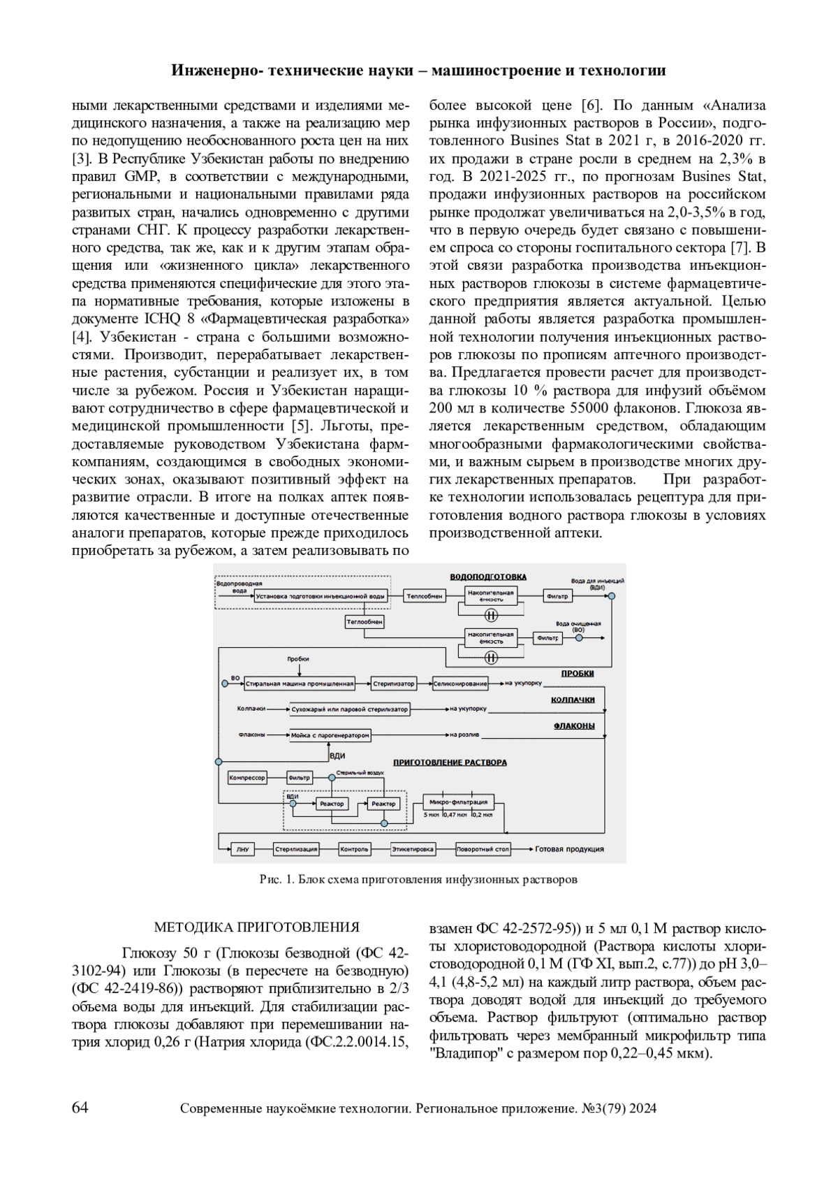 Ценность глюкозы в медицине обусловлена ее легким проникновением во все клетки. Ее раствор увеличивает клеточное давление, интенсифицирует основные процессы обмена веществ, стимулирует деятельность сердца, печени и почек, а также выработку многих гормонов и ферментов. Еще один эффект - иммуномодулирующий. Среди основных показаний, при которых назначают препарат, - гипогликемия, печеночные болезни, инфекции, обезвоживание, сопровождающееся рвотой и диареей, малое обогащение пищи углеводами, сердечные недуги, шок, коллапс и стресс. Кроме того, глюкоза входит в состав антибиотиков и других лекарств. Она отлично подходит для разведения некоторых лекарственных препаратов, вводимых парентерально. Таким образом, глюкоза - это лекарственное средство, обладающее многообразными фармакологическими свойствами, а также важное сырье в производстве многих других лекарственных препаратов. Следовательно, развитие технологии стерильных инъекционных растворов и инфузий глюкозы в Республике Узбекистан является обоснованным.