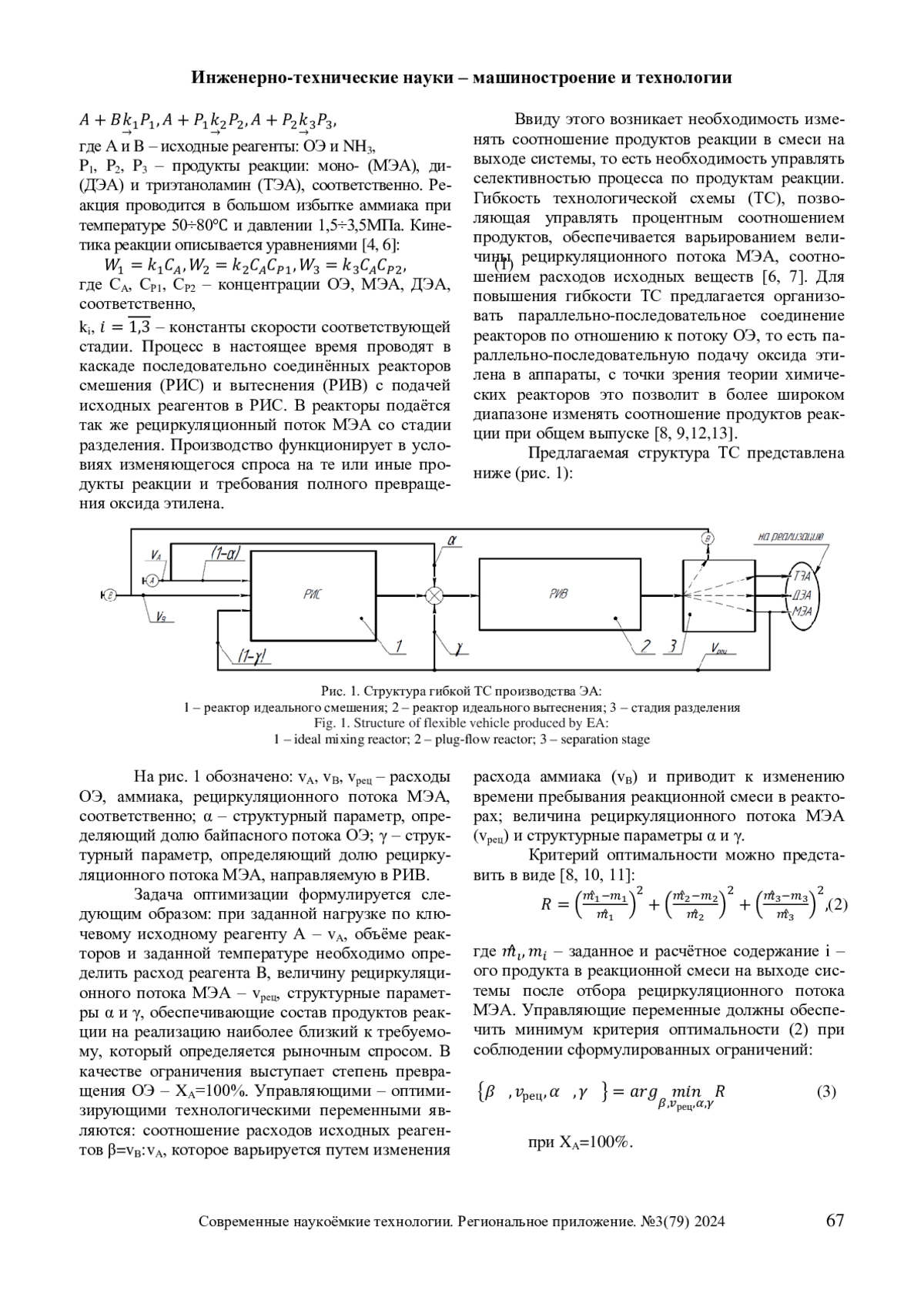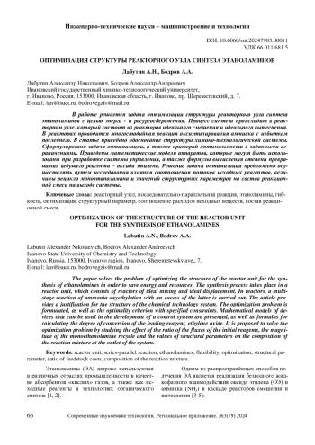 В работе решается задача оптимизации структуры реакторного узла синтеза этаноламинов с целью энерго - и ресурсосбережения. Процесс синтеза происходит в реакторном узле, который состоит из реакторов идеального смешения и идеального вытеснения. В реакторах проводится многостадийная реакция оксиэтилирования аммиака с избытком последнего. В статье приведено обоснование структуры химико-технологической системы. Сформулирована задача оптимизации, а также критерий оптимальности с заданными ограничениями. Приведены математические модели аппаратов, которые могут быть использованы при разработке системы управления, а также формулы вычисления степени превращения ведущего реагента - оксида этилена. Решение задачи оптимизации предложено осуществлять путем исследования влияния соотношения потоков исходных реагентов, величины рецикла моноэтаноламина и значений структурных параметров на состав реакционной смеси на выходе системы.