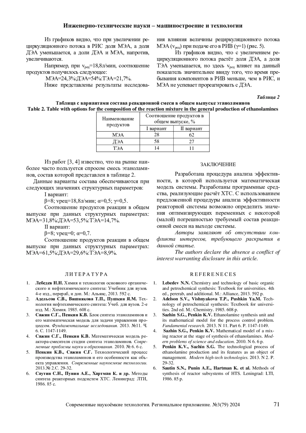 3. Сажин С.Г., Пенкин К.В. Блок синтеза этаноламинов и его математическая модель для задачи управления процессом. Фундаментальные исследования. 2013. №11. Ч. 6. С. 1147-1149. EDN: RUDDQP