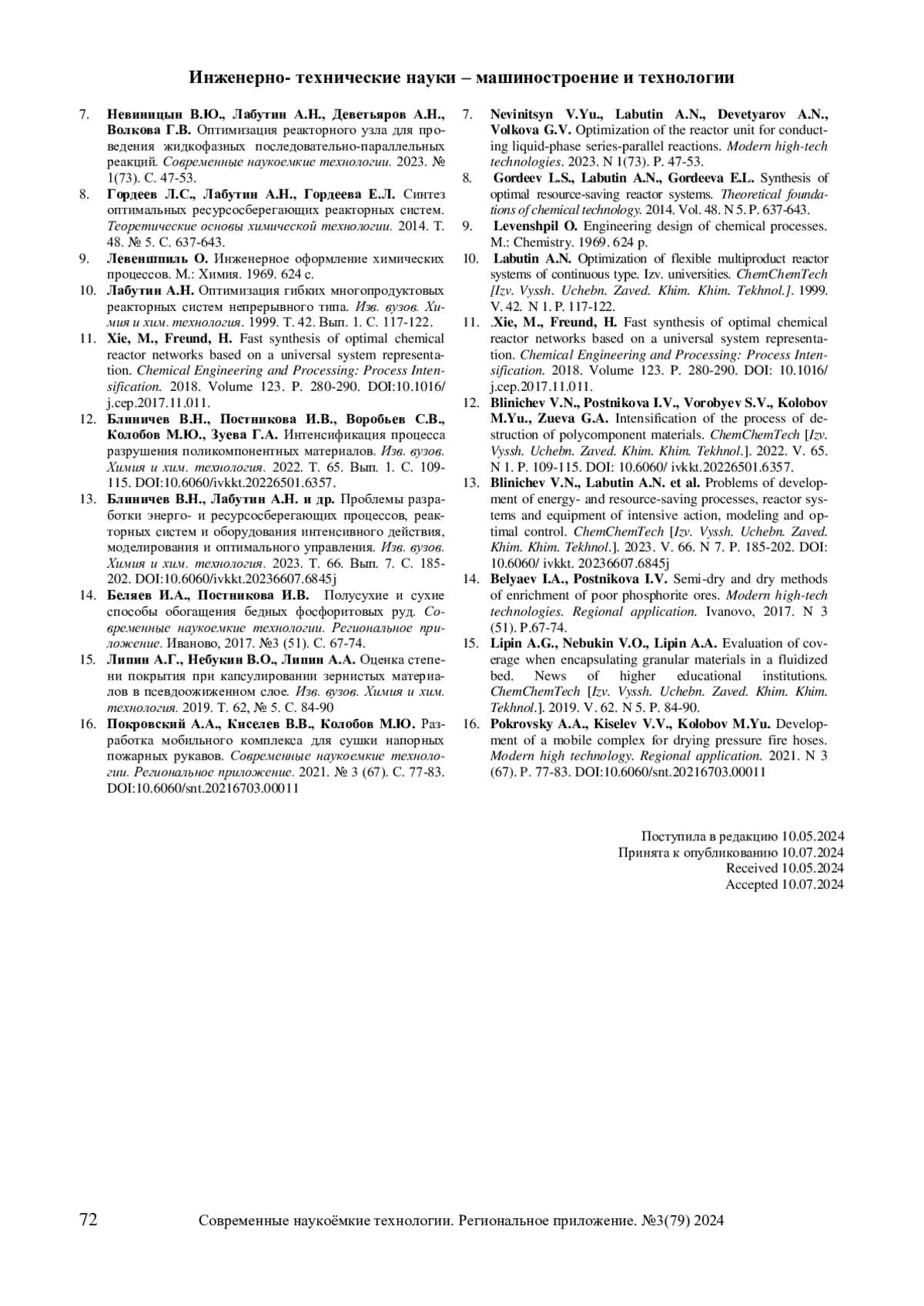 13. Блиничев В.Н., Лабутин А.Н. и др. Проблемы разработки энерго- и ресурсосберегающих процессов, реакторных систем и оборудования интенсивного действия, моделирования и оптимального управления. Изв. вузов. Химия и хим. технология. 2023. Т. 66. Вып. 7. С. 185-202. DOI: 10.6060/ivkkt.20236607.6845j EDN: TBGHOY