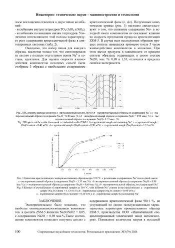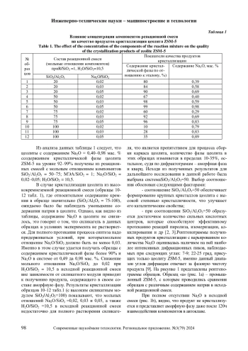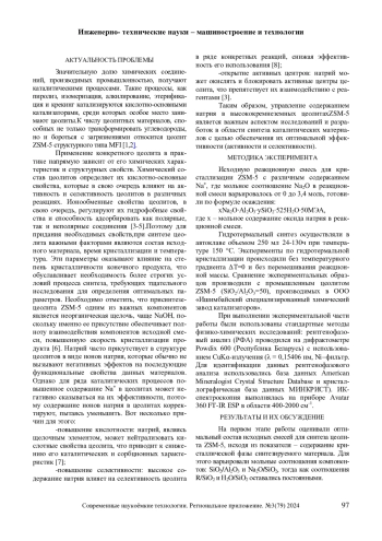 В работе рассматривается синтез высококремнеземных цеолитов типа ZSM-5 с модулем 50,0 и пониженным содержанием ионов Na+для процессов каталитического пиролиза биомассы, химической и смежных отраслей промышленности. Показано влияние различного содержанияNa2O (мольное соотношение Na2O в реакционной смеси варьировалось от 0 до 3,4 моль) на структуру получаемых высококремнеземных цеолитов типаZSM-5. При помощи методов рентгенофазового анализа, ИК-спектроскопии определено оптимальноесоотношение компонентов Na2О/SiO2 в цеолите ZSM-5, которое позволяет получить цеолит с высоким содержанием кристаллической фазы, соответствующее параметрам промышленного образца ZSM-5. Доказано, что при отсутствии в исходной смеси щелочных реагентов процесс кристаллизация продукта невозможен. Полученные в работе результаты интересны как с практической точки зрения при оптимизации процессов синтеза, так и с фундаментальной, при разработке новых способов получения цеолитов.