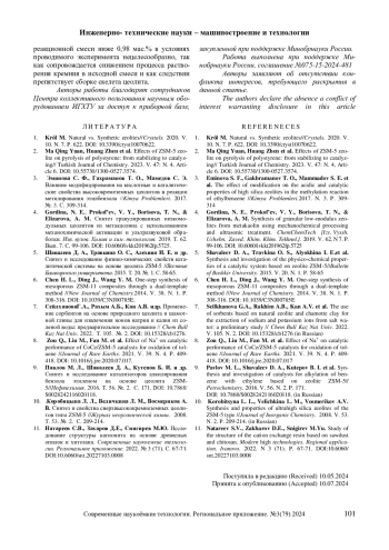 5. Шавалеев Д. А., Травкина О. С., Алехина И. Е. и др. Синтез и исследование физико-химических свойств каталитической системы на основе цеолита ZSM-5 //Вестник Башкирского университета. 2015. Т. 20. №. 1. С. 58-65. EDN: UIILJN