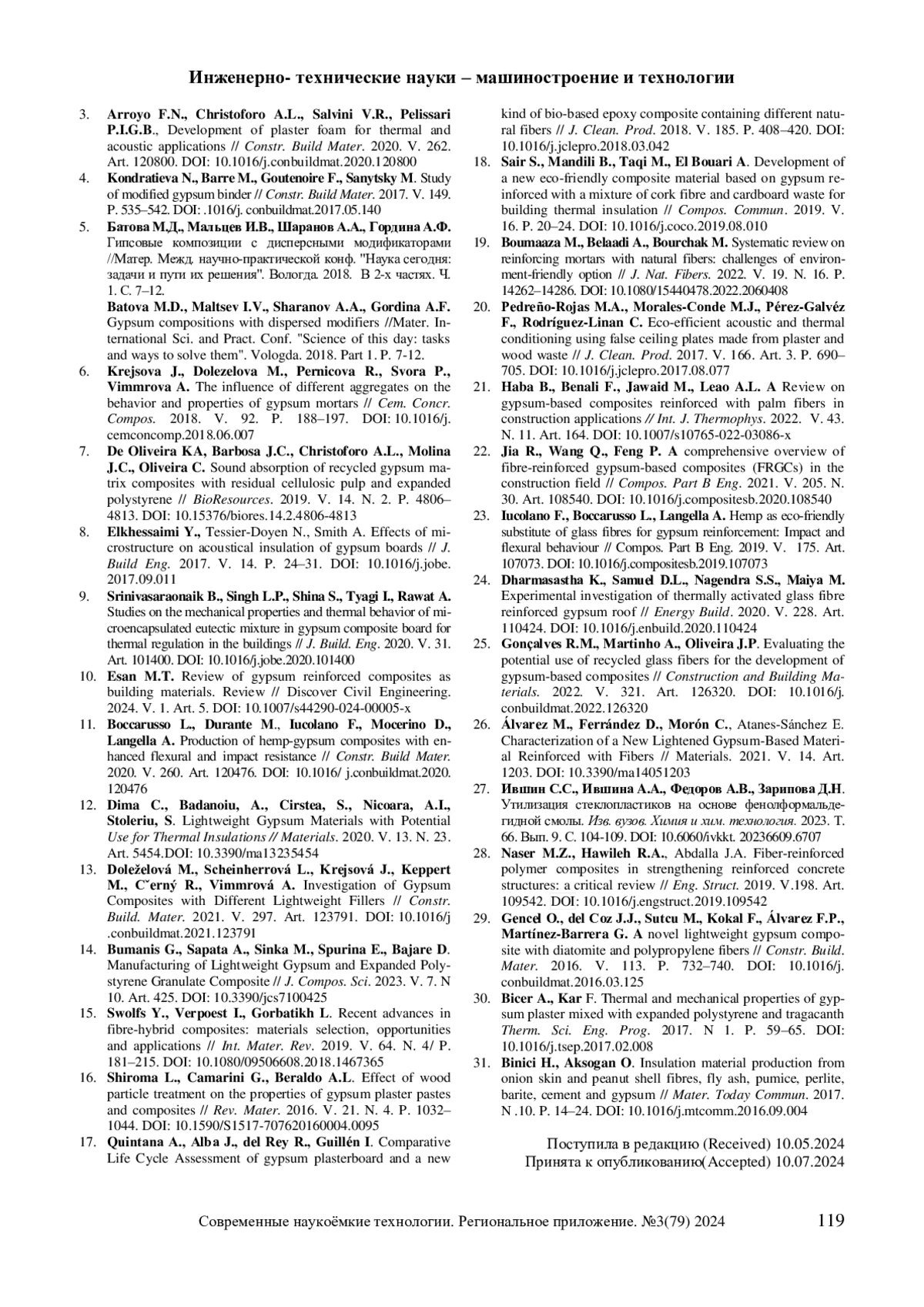 10. Esan M.T. Review of gypsum reinforced composites as building materials. Review // Discover Civil Engineering. 2024. V. 1. Art. 5. DOI: 10.1007/s44290-024-00005-x EDN: JEKDEI