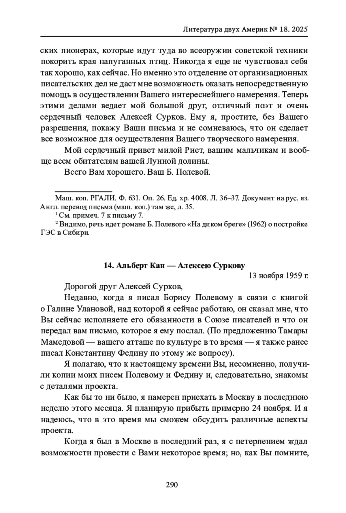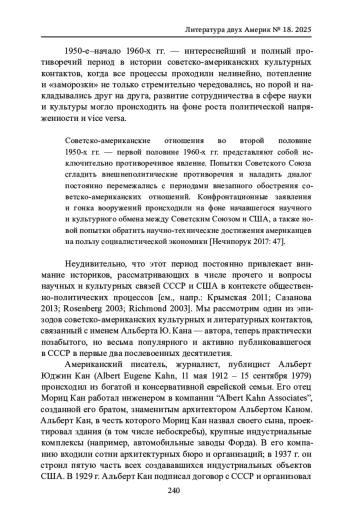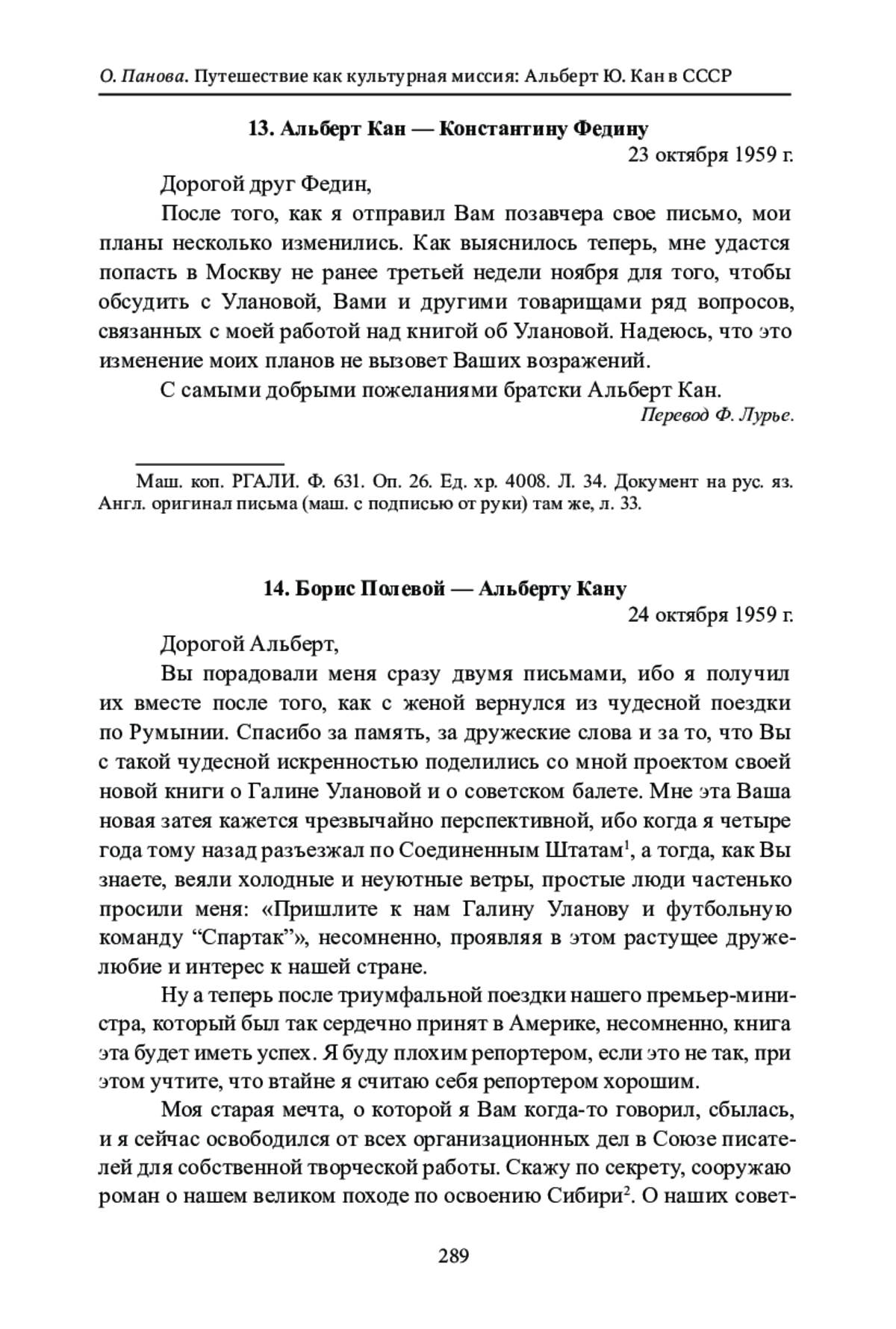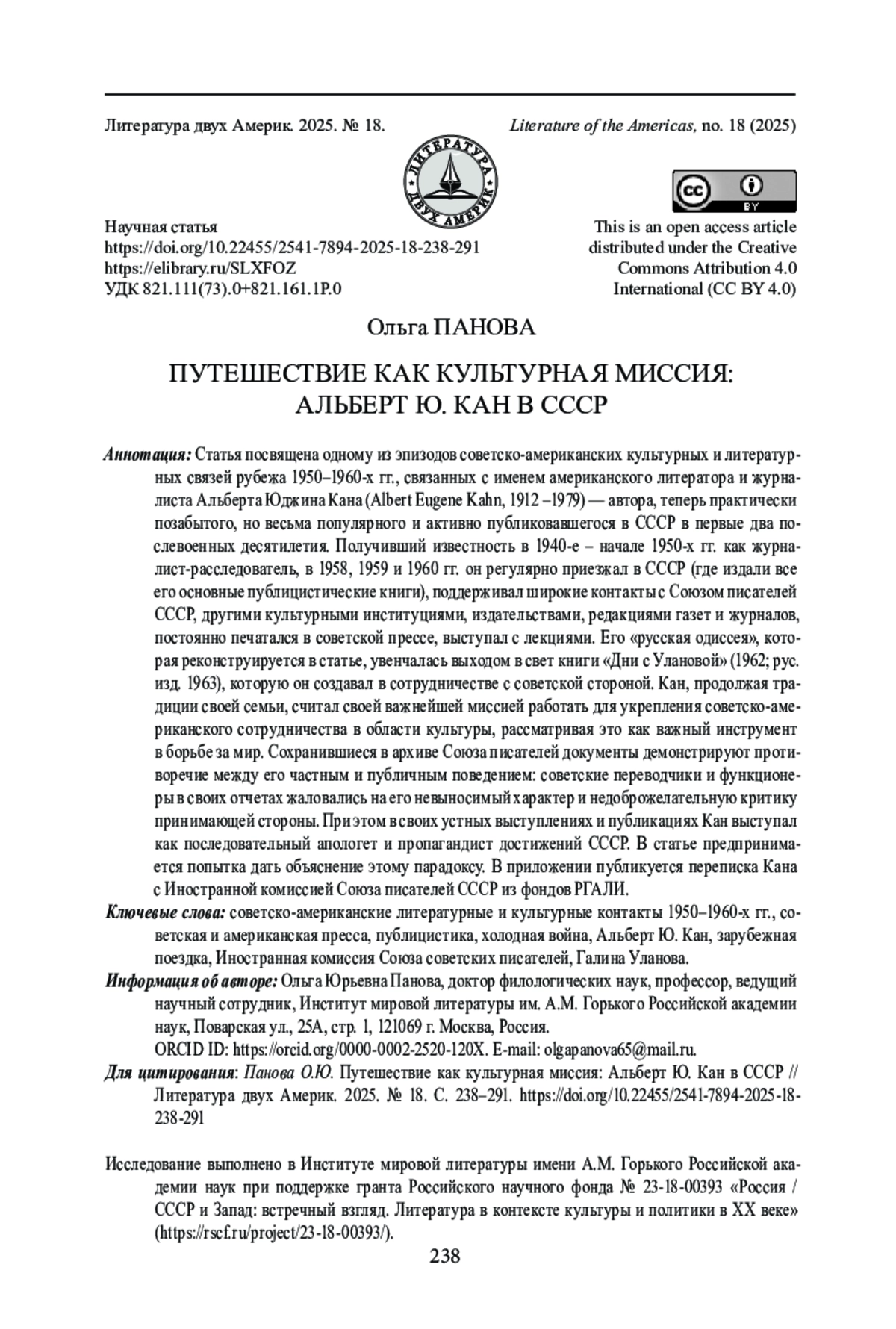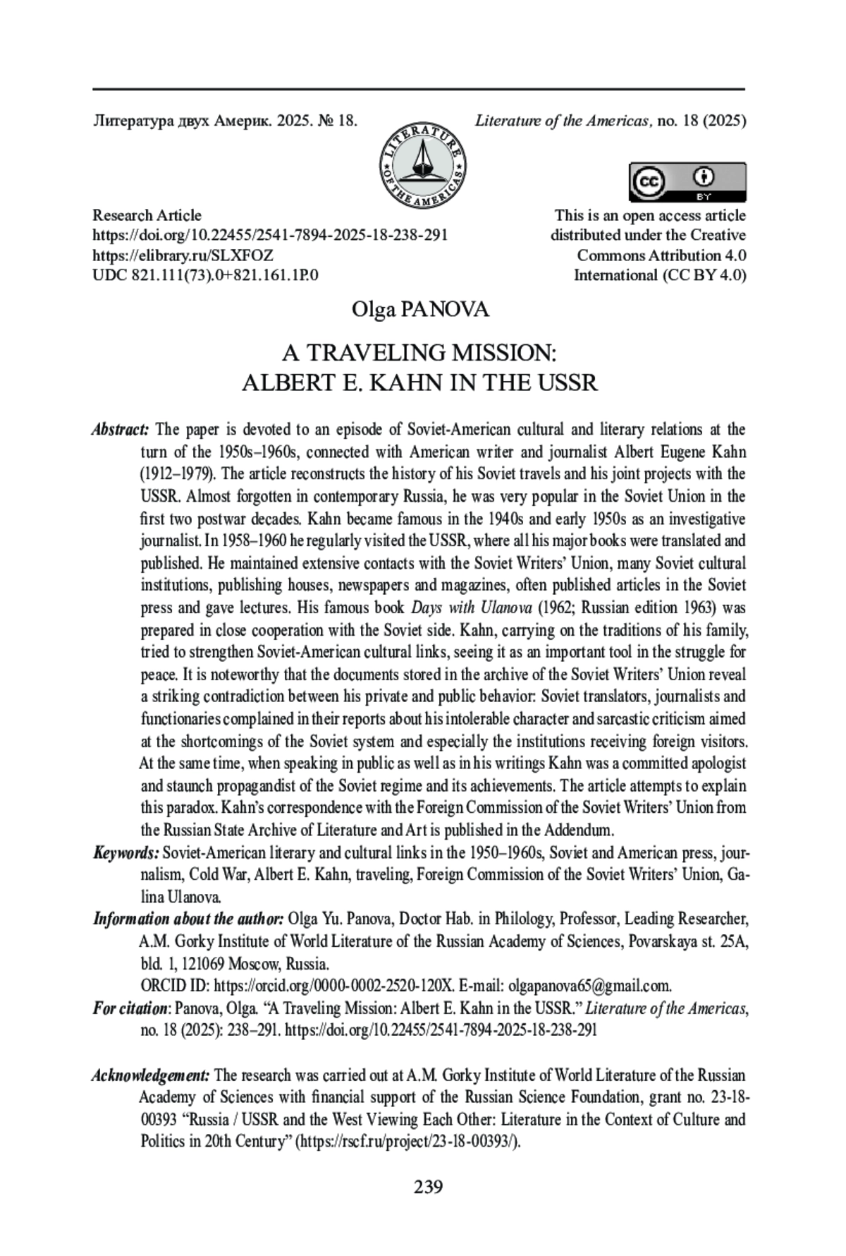 Статья посвящена одному из эпизодов советско-американских культурных и литературных связей рубежа 1950-1960-х гг., связанных с именем американского литератора и журналиста Альберта Юджина Кана (Albert Eugene Kahn, 1912 -1979) - автора, теперь практически позабытого, но весьма популярного и активно публиковавшегося в СССР в первые два послевоенных десятилетия. Получивший известность в 1940-е - начале 1950-х гг. как журналист-расследователь, в 1958, 1959 и 1960 гг. он регулярно приезжал в СССР (где издали все его основные публицистические книги), поддерживал широкие контакты с Союзом писателей СССР, другими культурными институциями, издательствами, редакциями газет и журналов, постоянно печатался в советской прессе, выступал с лекциями. Его «русская одиссея», которая реконструируется в статье, увенчалась выходом в свет книги «Дни с Улановой» (1962; рус. изд. 1963), которую он создавал в сотрудничестве с советской стороной. Кан, продолжая традиции своей семьи, считал своей важнейшей миссией работать для укрепления советско-американского сотрудничества в области культуры, рассматривая это как важный инструмент в борьбе за мир. Сохранившиеся в архиве Союза писателей документы демонстрируют противоречие между его частным и публичным поведением: советские переводчики и функционеры в своих отчетах жаловались на его невыносимый характер и недоброжелательную критику принимающей стороны. При этом в своих устных выступлениях и публикациях Кан выступал как последовательный апологет и пропагандист достижений СССР. В статье предпринимается попытка дать объяснение этому парадоксу. В приложении публикуется переписка Кана с Иностранной комиссией Союза писателей СССР из фондов РГАЛИ.