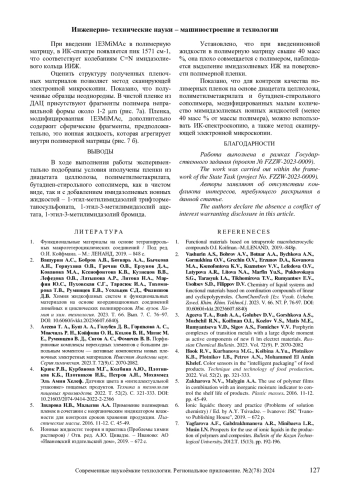 7. Ягфарова А.Ф., Габдрахманова А.Р., Минибаева Л.Р., Мусин И.Н. Перспективы использования ионных жидкостей при получении полимеров и композитов. Вестник казанского технологического университета. 2012.Т. 15(13). С. 192-196. EDN: PCAENP
