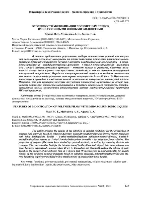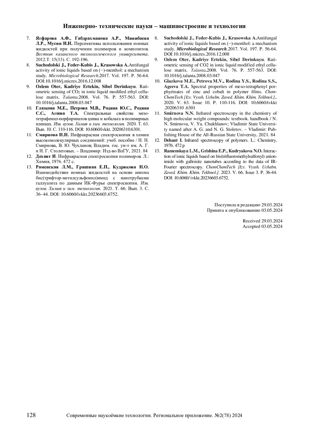 13. Раменская Л.М., Гришина Е.П., Кудрякова Н.О. Взаимодействие ионных жидкостей на оcнове аниона бис(трифтор-метилсульфонил)имид с нанотрубками галлуазита по данным ИК-Фурье спектроскопии. Изв. вузов. Химия и хим. технология. 2023. Т. 66. Вып. 3. С. 36-44. DOI: 10.6060/ivkkt.20236603.6752 EDN: IGIKCU