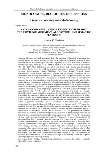 Обсуждаются результаты критического анализа А. В. Нехаева таких направлений современной философии языка, как семантический диспозиционализм и семантический платонизм в контексте решения скептической проблемы следования правилу. Фиксируются как недостатки анализа Нехаева, так и недостатки самого семантического платонизма на примере концепции Д. Катца в контексте дискуссии реализма и антиреализма.