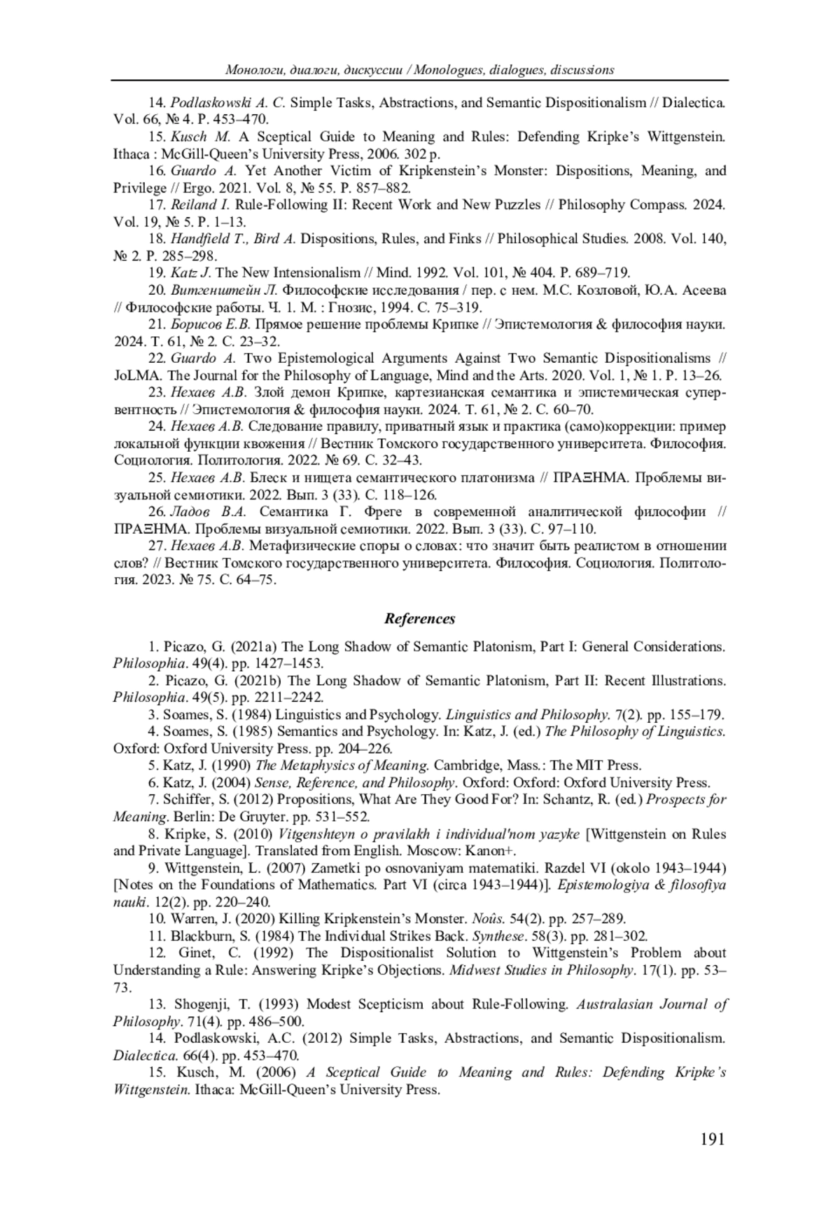 16. Guardo A. Yet Another Victim of Kripkenstein’s Monster: Dispositions, Meaning, and Privilege // Ergo. 2021. Vol. 8, № 55. P. 857-882.
