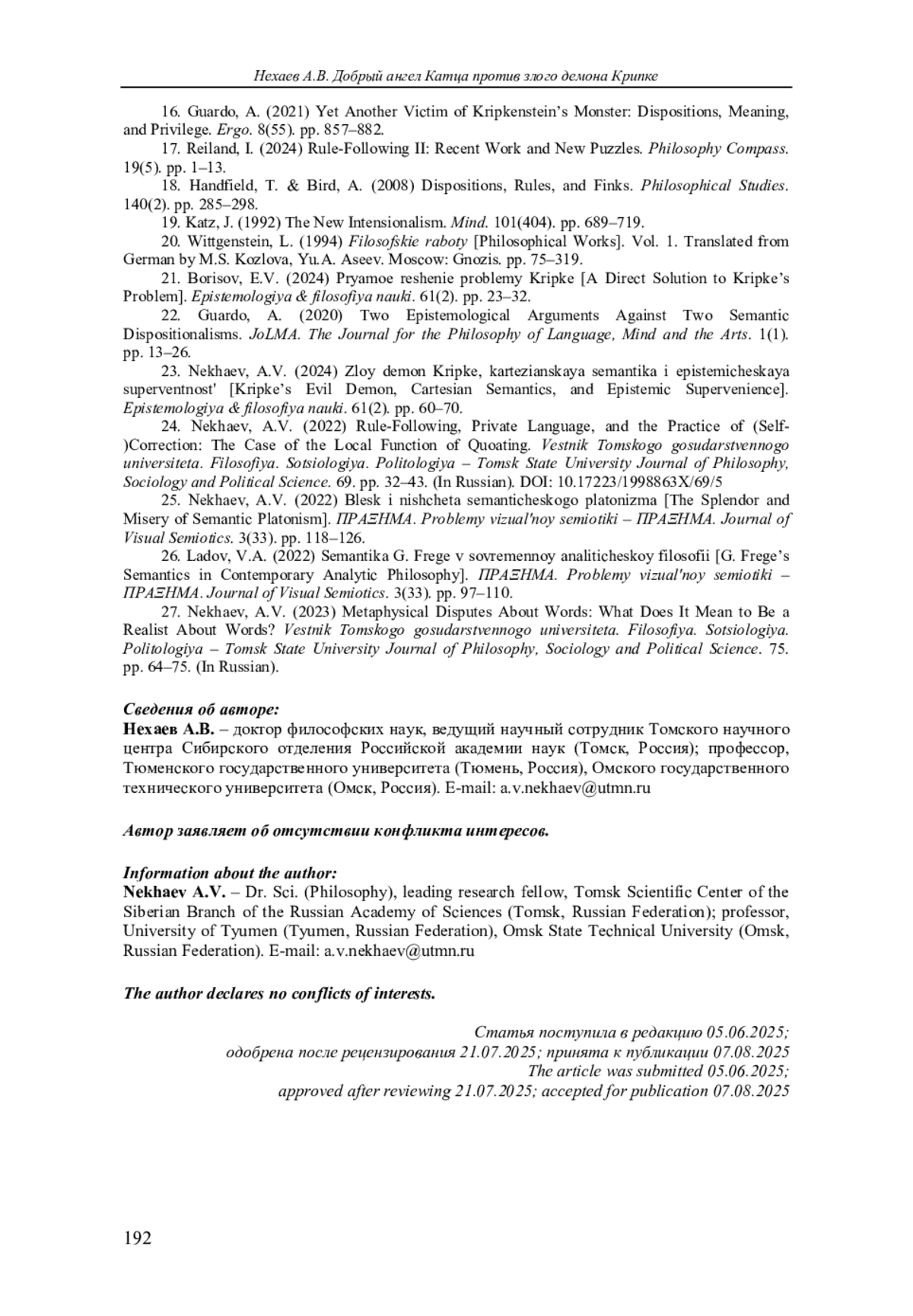 24. Нехаев А.В. Следование правилу, приватный язык и практика (само)коррекции: пример локальной функции квожения // Вестник Томского государственного университета. Философия. Социология. Политология. 2022. № 69. С. 32-43. EDN: RXUCCB