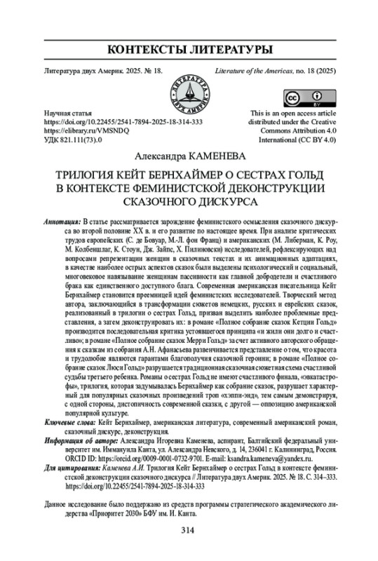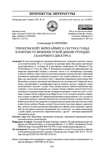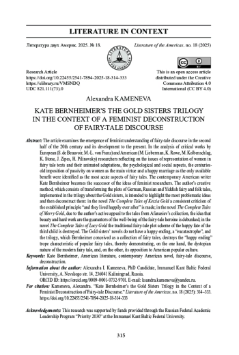 В статье рассматривается зарождение феминистского осмысления сказочного дискурса во второй половине XX в. и его развитие по настоящее время. При анализе критических трудов европейских (С. де Бовуар, М.-Л. фон Франц) и американских (М. Либерман, К. Роу, М. Колбеншлаг, К. Стоун, Дж. Зайпс, Х. Пилиновски) исследователей, рефлексирующих над вопросами репрезентации женщин в сказочных текстах и их анимационных адаптациях, в качестве наиболее острых аспектов сказок были выделены психологический и социальный, многовековое навязывание женщинам пассивности как главной добродетели и счастливого брака как единственного доступного блага. Современная американская писательница Кейт Бернхаймер становится преемницей идей феминистских исследователей. Творческий метод автора, заключающийся в трансформации сюжетов немецких, русских и еврейских сказок, реализованный в трилогии о сестрах Гольд, призван выделить наиболее проблемные представления, а затем деконструировать их: в романе «Полное собрание сказок Кетции Гольд» производится последовательная критика устоявшегося принципа «и жили они долго и счастливо»; в романе «Полное собрание сказок Мерри Гольд» за счет активного авторского обращения к сказкам из собрания А. Н. Афанасьева развенчивается представление о том, что красота и трудолюбие являются гарантами благополучия сказочной героини; в романе «Полное собрание сказок Люси Гольд» разрушается традиционная сказочная сюжетная схема счастливой судьбы третьего ребенка. Романы о сестрах Гольд не имеют счастливого финала, «эвкатастрофы», трилогия, которая задумывалась Бернхаймер как собрание сказок, разрушает характерный для популярных сказочных произведений троп «хэппи-энд», тем самым демонстрируя, с одной стороны, дистопичность современной сказки, с другой - оппозицию американской популярной культуре.