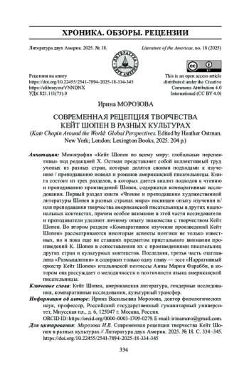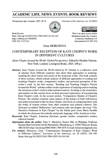 Монография «Кейт Шопен по всему миру: глобальные перспективы» под редакцией Х. Остман представляет собой коллективный труд ученых из разных стран, которые делятся своими подходами к изучению / преподаванию новелл и романов американской писательницы. Книга состоит из трех разделов, в которых дается анализ подходов к чтению и преподаванию произведений Шопен, содержатся компаративные исследования. Первый раздел книги «Чтение и преподавание художественной литературы Шопен в разных странах мира» посвящен опыту изучения и/ или преподавания творчества американской писательницы в других национальных контекстах, причем особое внимание в этой части исследователи и преподаватели уделяют личному опыту знакомства с творчеством Кейт Шопен. Во втором разделе «Компаративное изучение произведений Кейт Шопен» рассматриваются некоторые аспекты поэтики не только известных, но и пока еще не ставших предметом пристального внимания произведений К. Шопен в сопоставлении их с произведениями писательниц других стран и культурных контекстов. Последняя, третья часть озаглавлена «Размышления» и содержит только одну главу - эссе «Нарративный оркестр Кейт Шопен» итальянской поэтессы Анны Марии Фарабби, в котором она рассуждает о мелодичности и поэтичности языка американской писательницы.