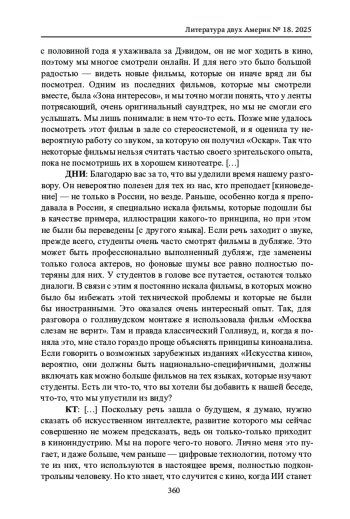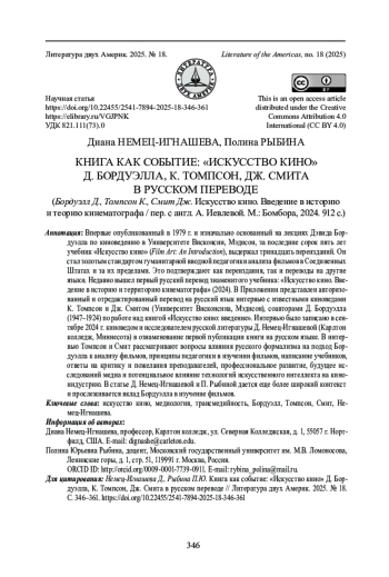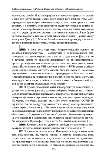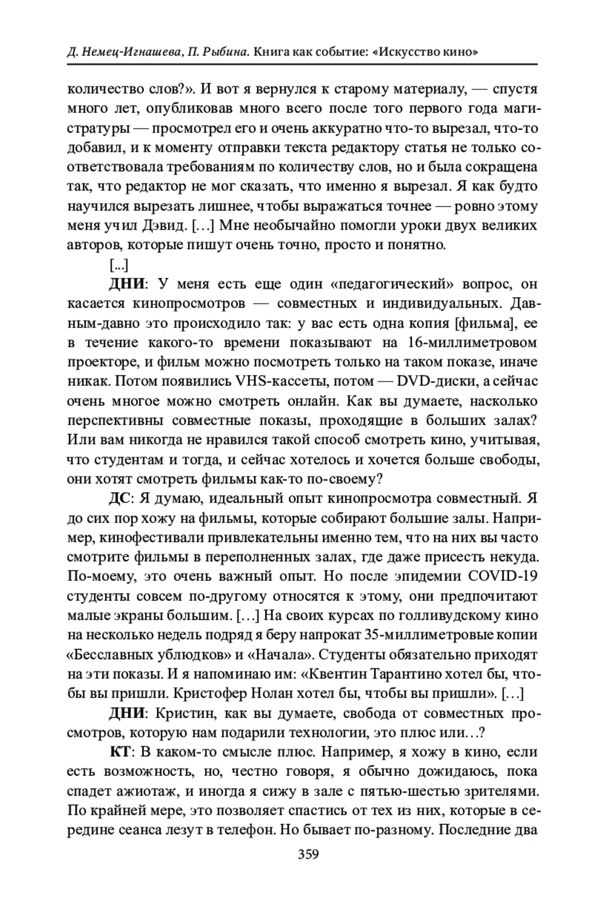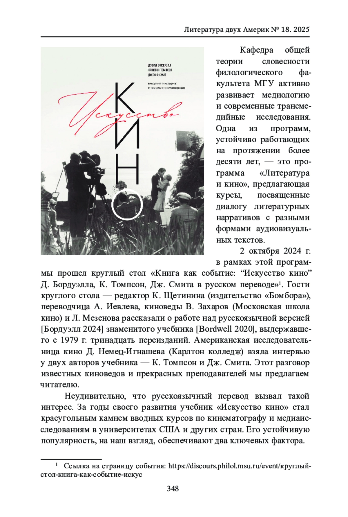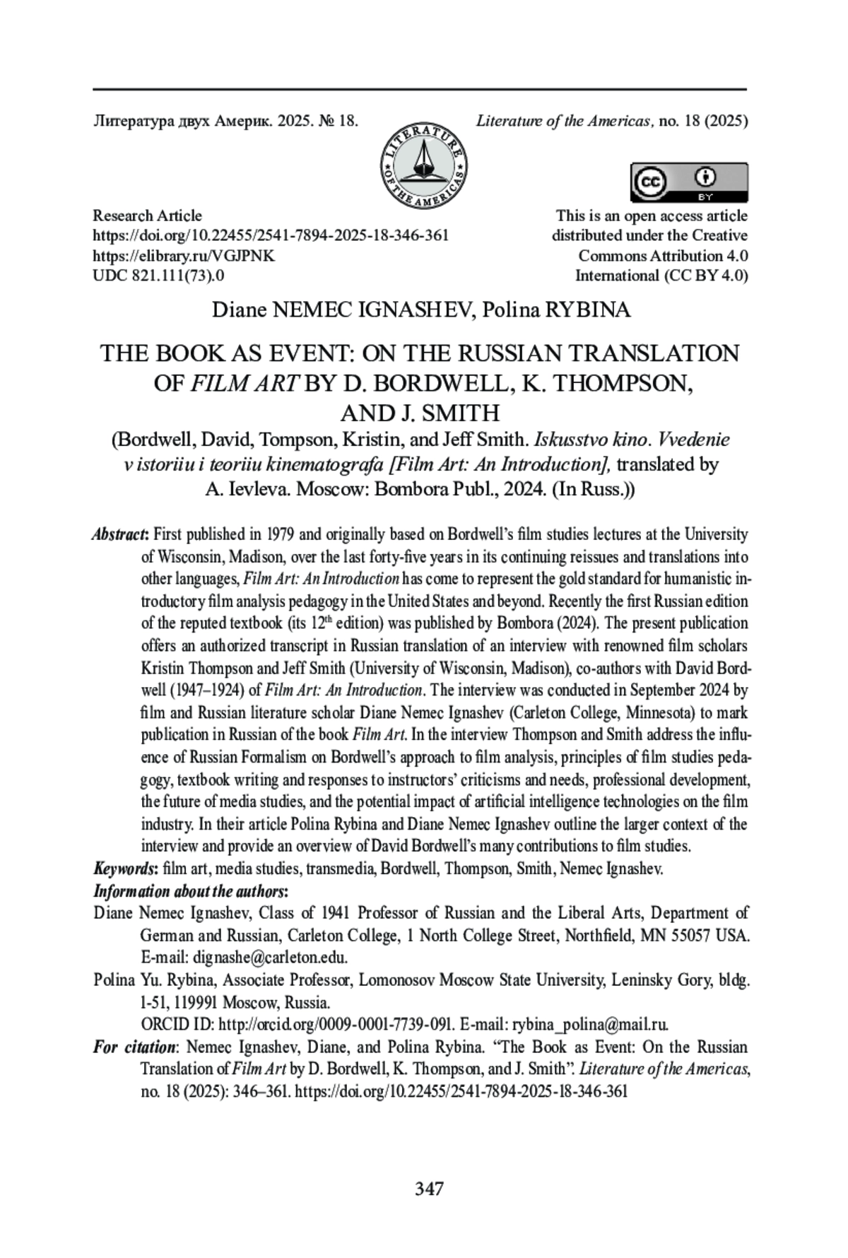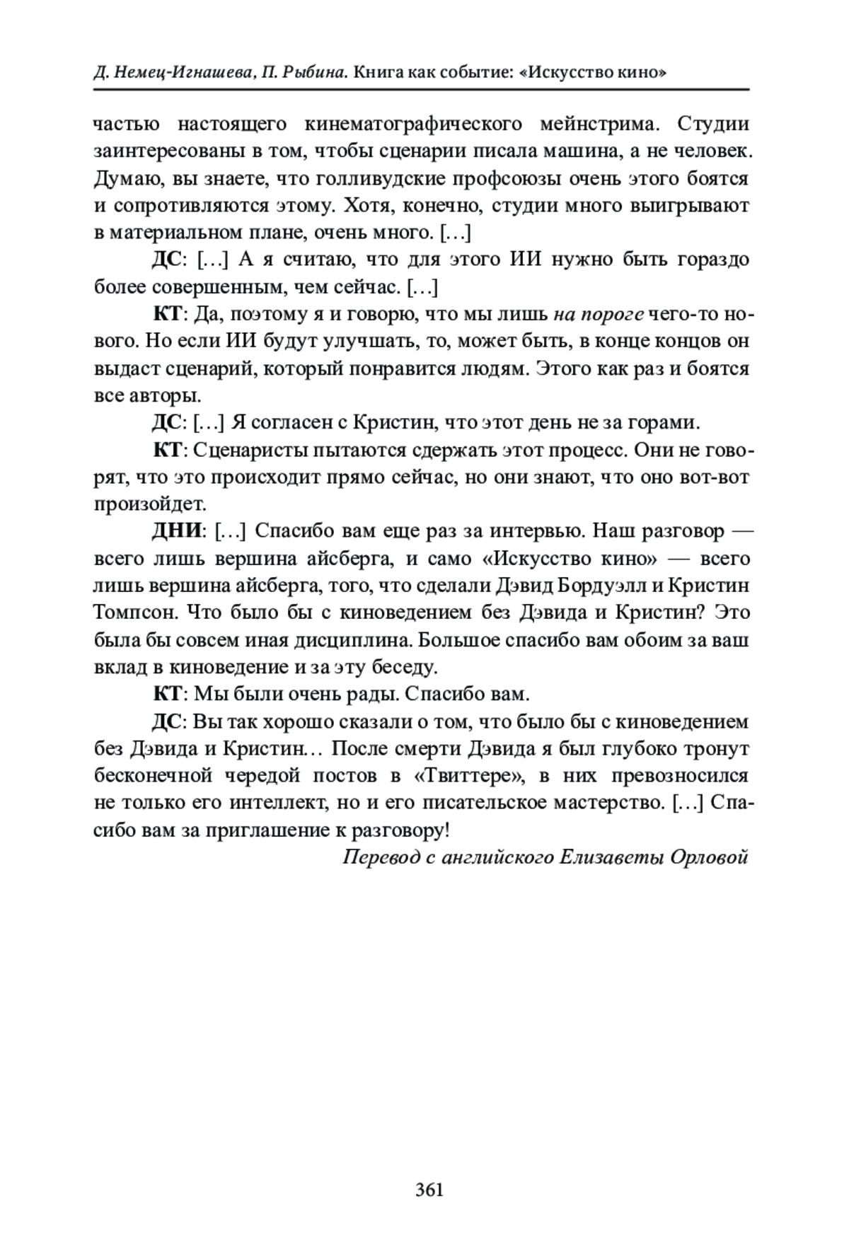 Д. Бордуэлла, К. Томпсон и Дж. Смита, а также о специфике переноса киноведческих текстов из одной культуры в другую. Темы развиты в интервью Д. Немец-Игнашевой (киновед, исследователь русской литературы) с авторами учебника. Круг проблем, с которыми столкнулся переводчик книги, был актуален и для перевода этого интервью на русский язык.