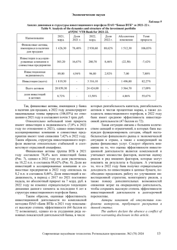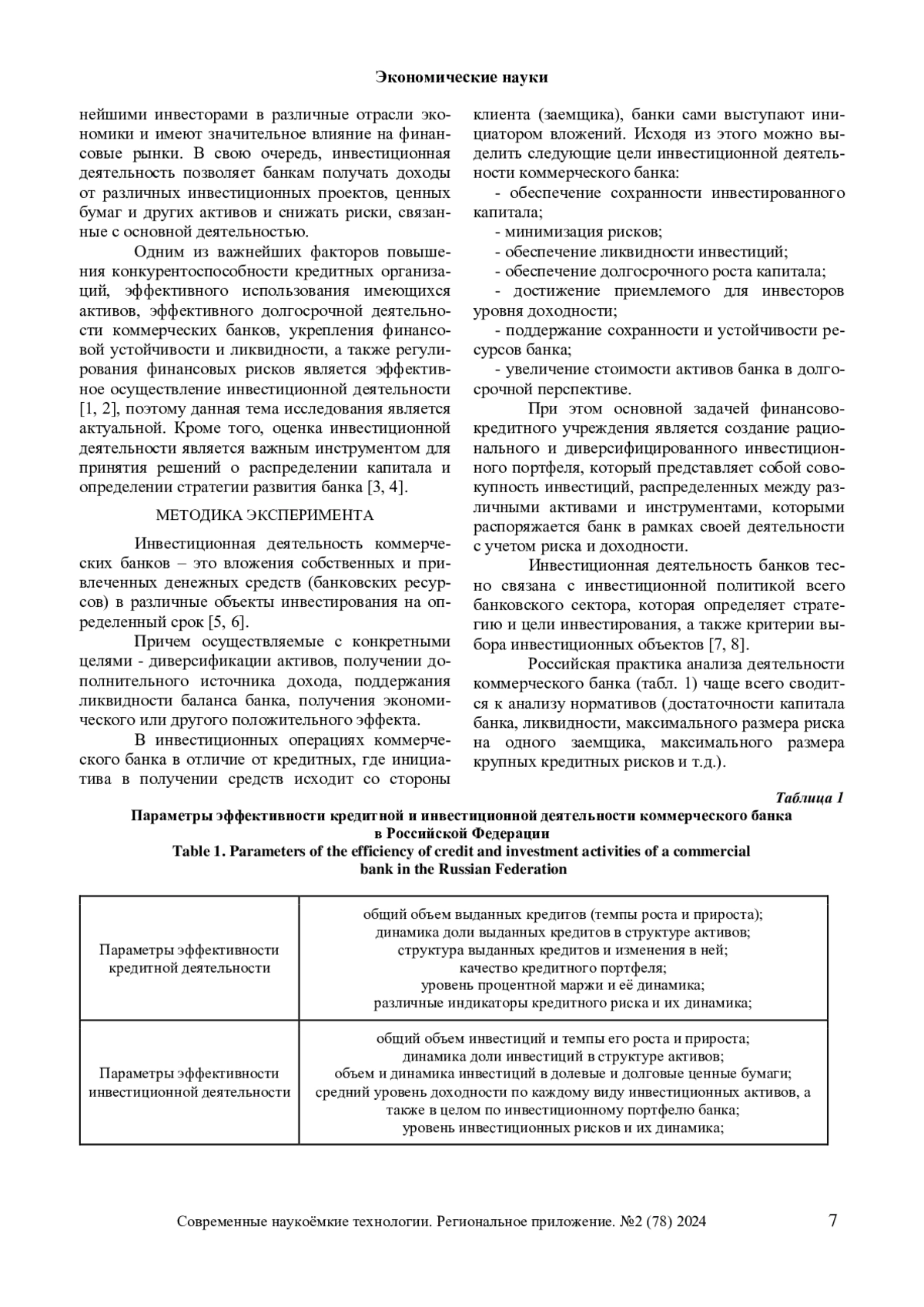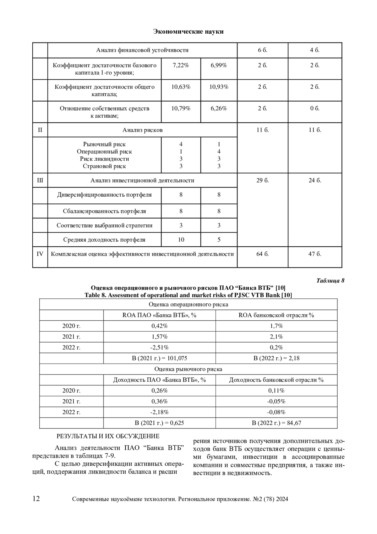 Эффективная инвестиционная деятельность позволяет банкам диверсифицировать свои активы, снижая риски и обеспечивая стабильный поток доходов. Кроме того, инвестиции помогают банкам укрепить свою позицию на рынке, привлекая новых клиентов и улучшая свою репутацию. В статье представлены результаты оценки эффективности инвестиционной деятельности ПАО «Банка ВТБ». Особое внимание уделяется анализу имеющихся методов оценки эффективности (отечественным и зарубежным) и их применению в практике банковского дела. Также разработана новая методика, которая представляет собой комплексный подход к оценке эффективности инвестиционной деятельности. В статье предлагаются рекомендации по оптимизации инвестиционной деятельности банка. Результаты исследования могут быть полезны для специалистов в области финансов и банковского дела, а также для принятия управленческих решений в коммерческих банках.