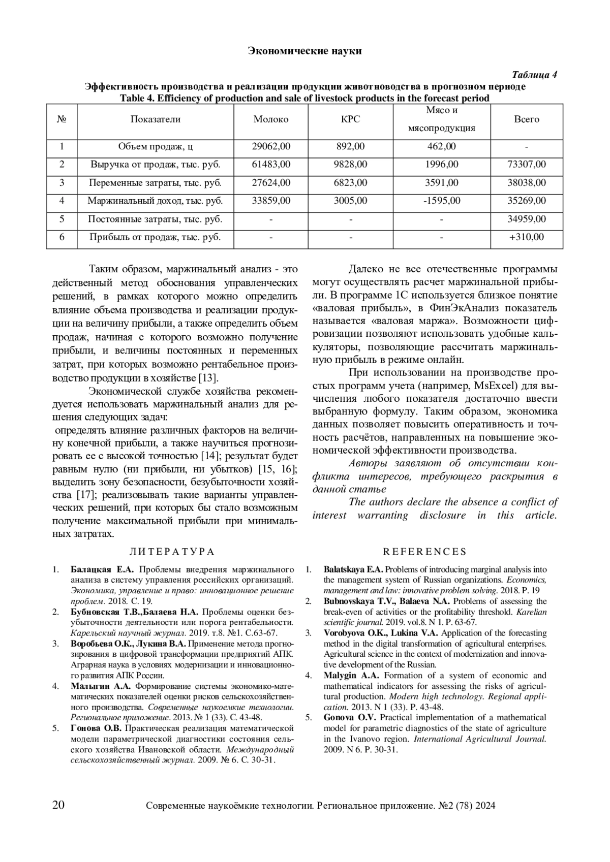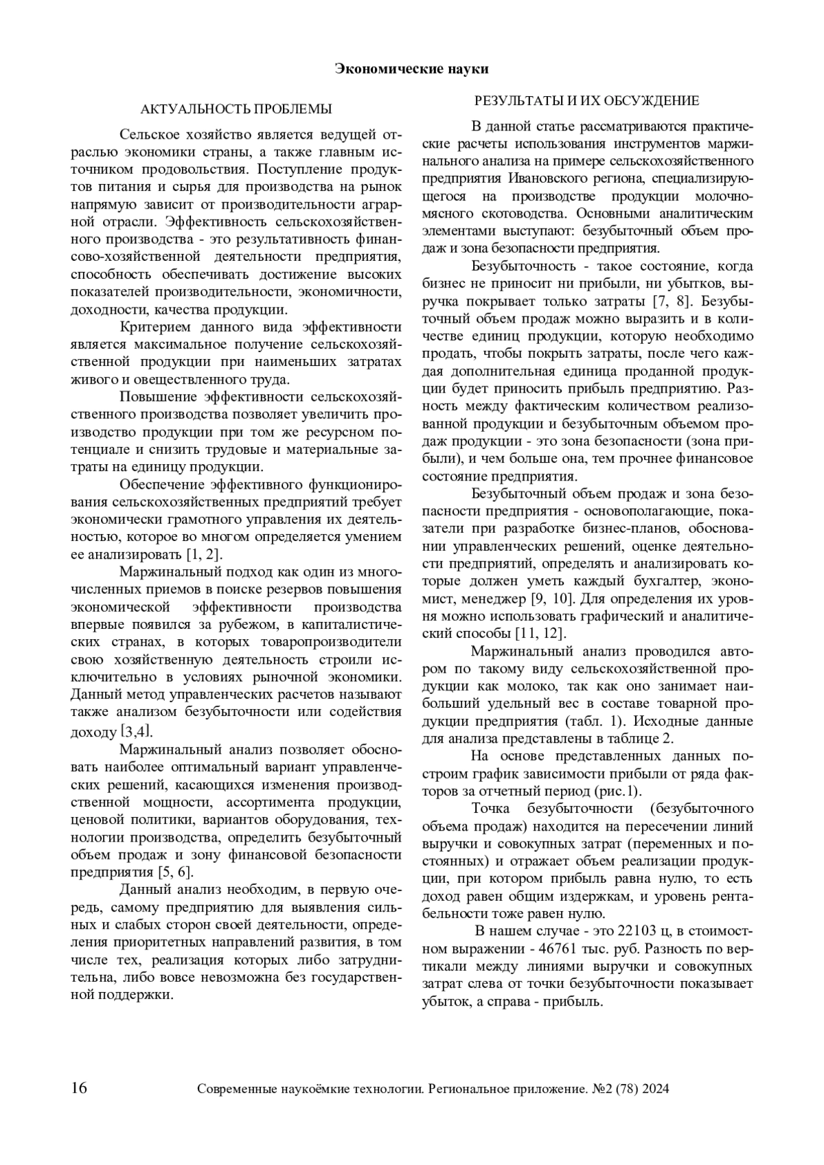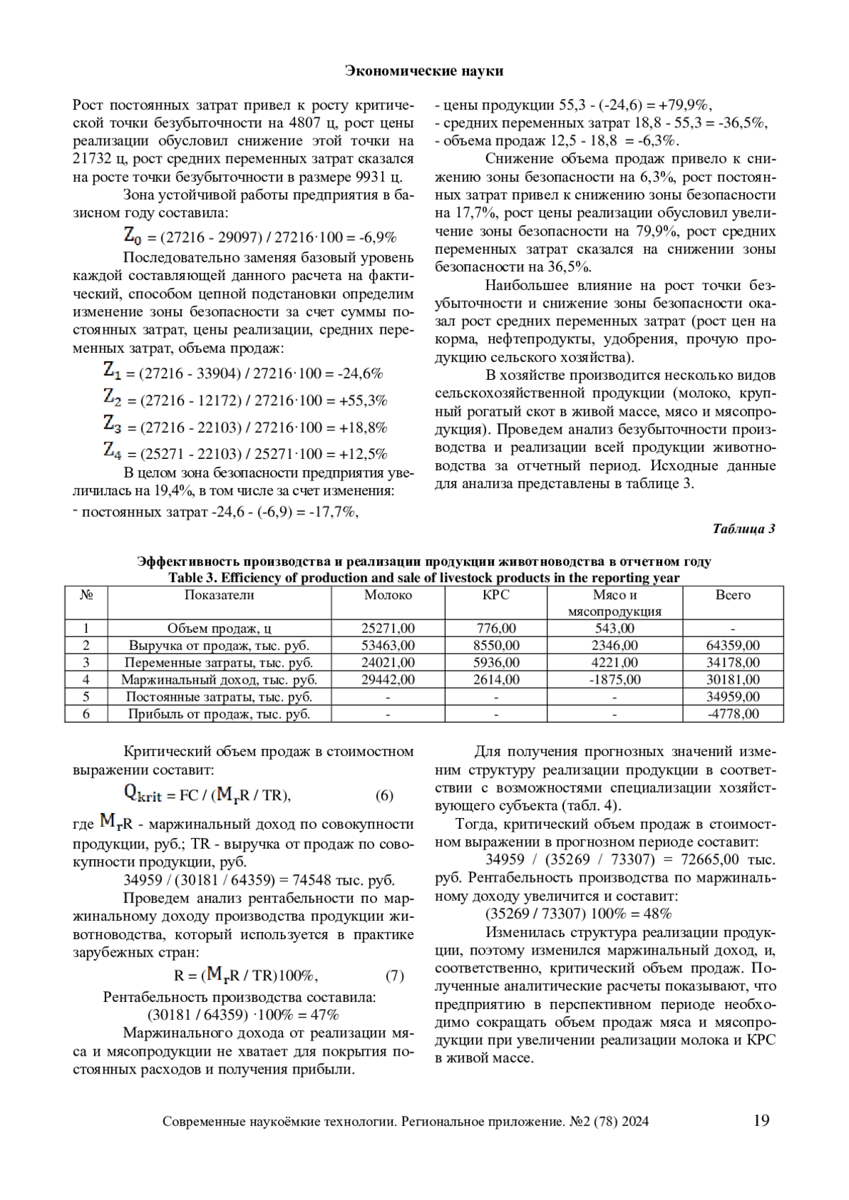 В данной статье рассматриваются вопросы практического применения методов маржинального подхода при оценке эффективности сельскохозяйственного производства. Экономика данных выходит на первый план при решении стратегических задач конкретного субъекта хозяйствования в перспективном периоде. Безубыточный объем продаж, зона безопасности предприятия занимают центральное место в поиске резервов повышения экономической эффективности производства. На примере фактологической информации типичного предприятия аграрной сферы Ивановского региона, специализирующегося на производстве продукции животноводства, проведён пошаговый маржинальный анализ, включающий в себя графический и аналитический приём нахождения безубыточности. Кроме этого, выполнен факторный анализ зоны безопасности и осуществлены прогнозные расчеты повышения эффективность производства продукции животноводства за счет изменения структуры её реализации. Полученные результаты указывают на необходимость снижения затрат на производство сельскохозяйственной продукции и пересмотр товарной направленности предприятия.