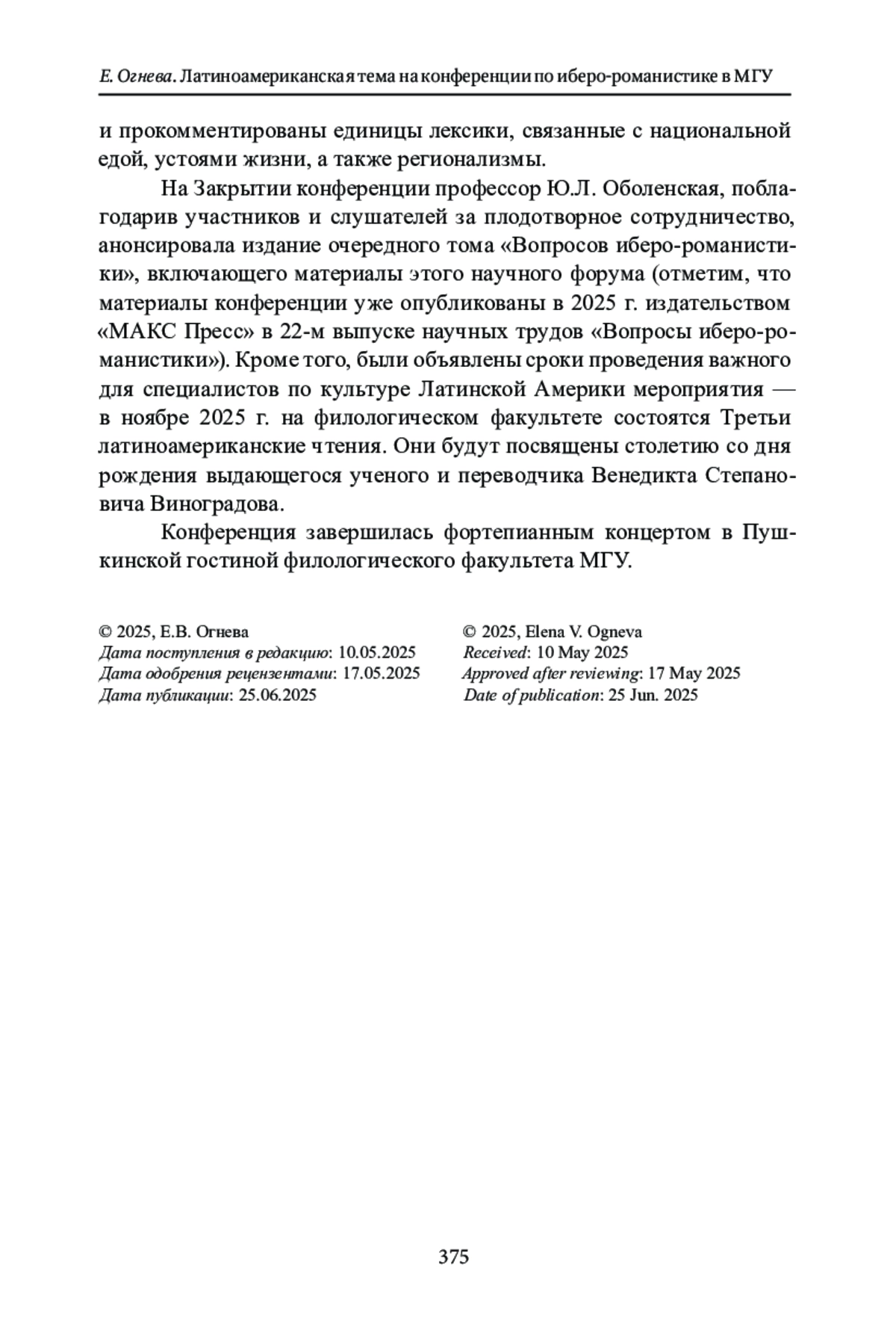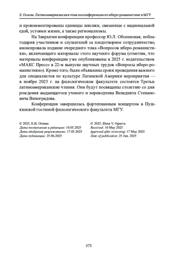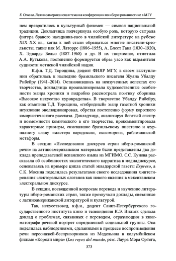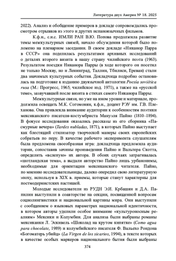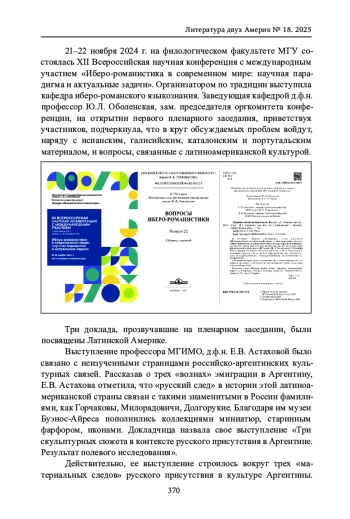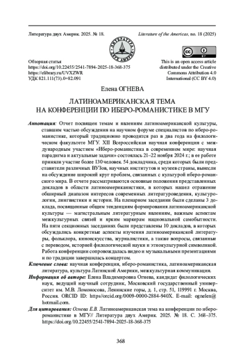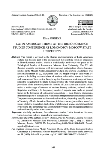 Отчет посвящен темам и явлениям латиноамериканской культуры, ставшим частью обсуждения на научном форуме специалистов по иберо-романистике, который традиционно проводится раз в два года на филологическом факультете МГУ. XII Всероссийская научная конференция с международным участием «Иберо-романистика в современном мире: научная парадигма и актуальные задачи» состоялась 21-22 ноября 2024 г.; в ее работе приняли участие более 130 человек. 54 докладчика, среди которых были представители различных ВУЗов, научных институтов и музеев страны, вынесли на обсуждение широкий круг проблем, связанных с культурой иберо-романского мира. В отчете рассматриваются основные положения представленных докладов в области латиноамериканистики, в которых нашел отражение обширный диапазон интересов современных литературоведения, культурологии, лингвистики и истории. На пленарном заседании были сделаны 3 доклада, посвященные общим тенденциям формирования латиноамериканской культуры - магистральным литературным явлениям, важным аспектам межкультурных связей и ярким маркерам национальной самобытности. На пяти секционных заседаниях были представлены 10 докладов, в которых обсуждались конкретные аспекты изучения латиноамериканской литературы, фольклора, киноискусства, журналистики, а также вопросы, связанные с переводом, историей филологической науки и этнокультурной символикой. Работа конференции сопровождалась видео и музыкальными презентациями и по традиции завершилась концертом.