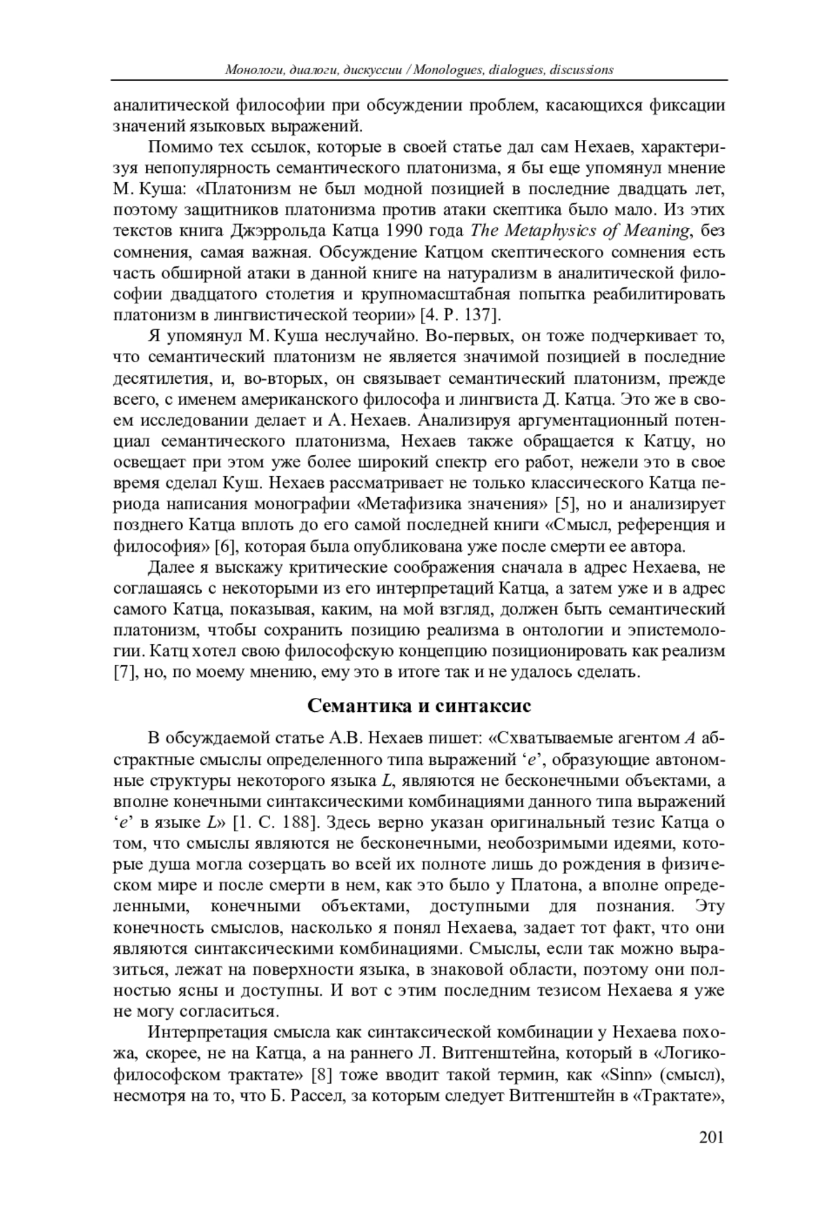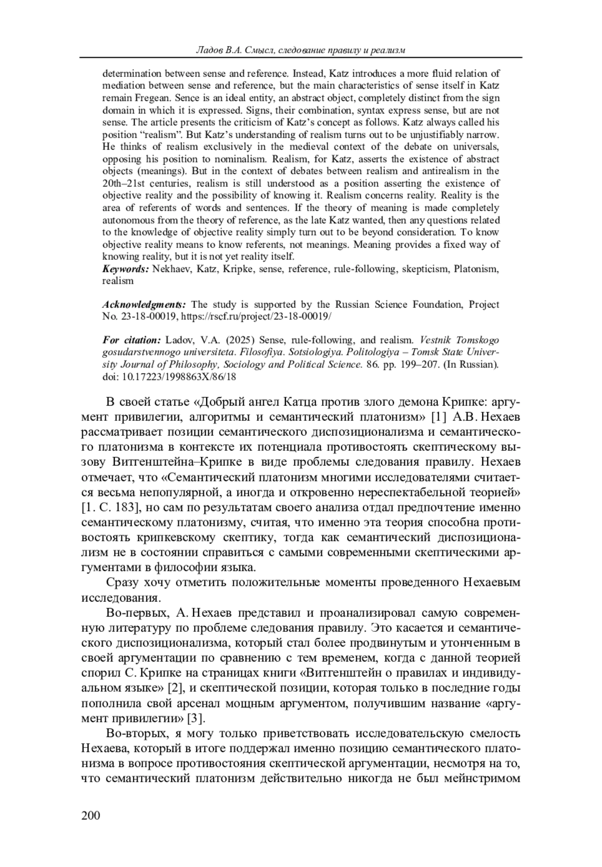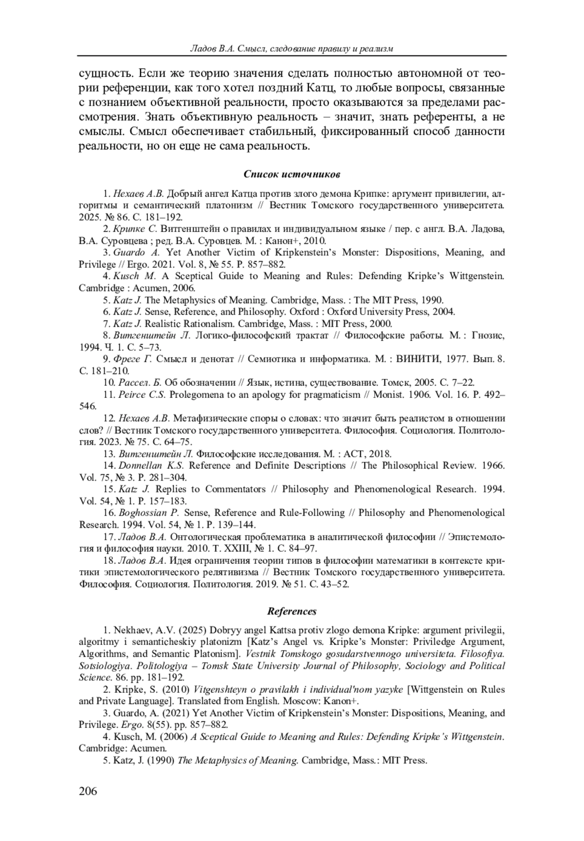 1. Нехаев А.В. Добрый ангел Катца против злого демона Крипке: аргумент привилегии, алгоритмы и семантический платонизм // Вестник Томского государственного университета. 2025. № 86. С. 181-192.
