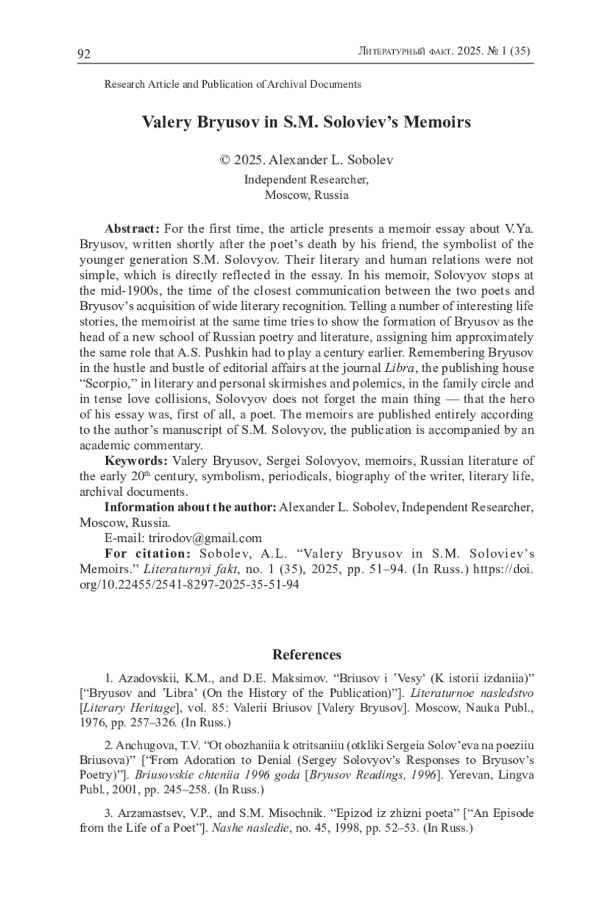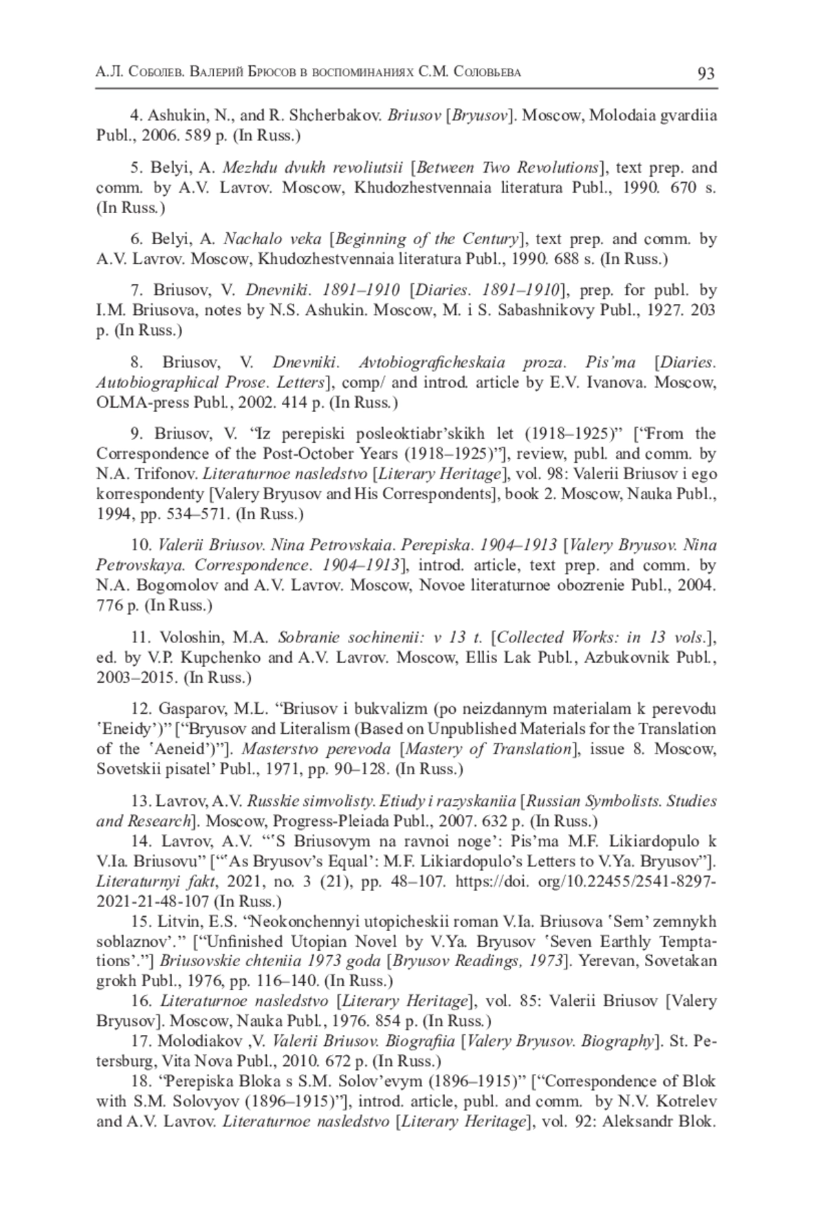 20. Соболев А.Л. А.Я. Брюсов и В.Ф. Ходасевич. Переписка // Russian literature. 2016. Vol. 83-84. P. 259-307.