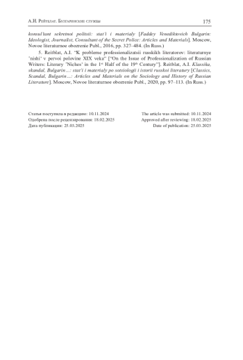 5. Рейтблат А.И. К проблеме профессионализации русских литераторов: литературные “ниши” в первой половине XIX века // Рейтблат А.И. Классика, скандал, Булгарин…: статьи и материалы по социологии и истории русской литературы. М.: НЛО, 2020. С. 97-113.