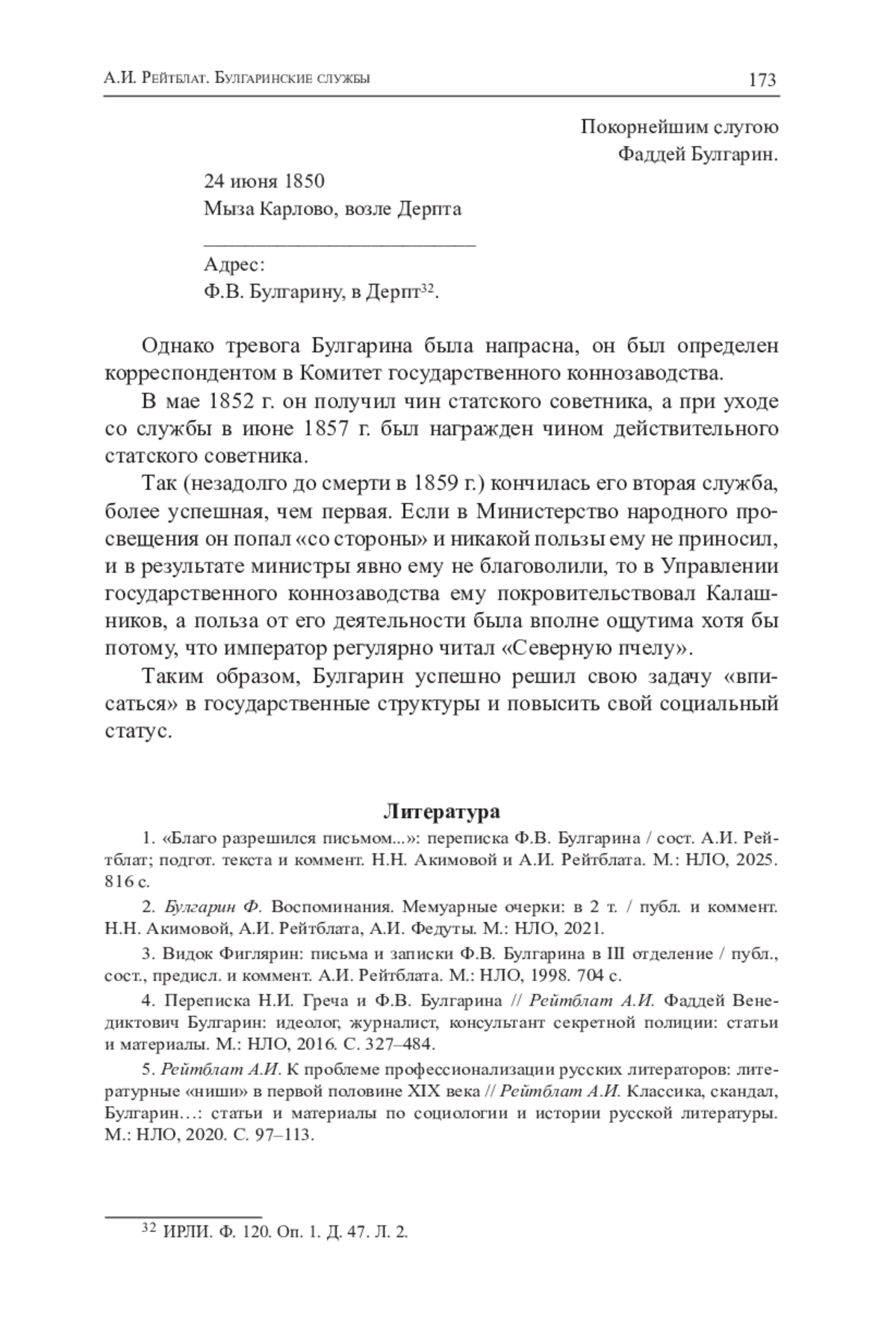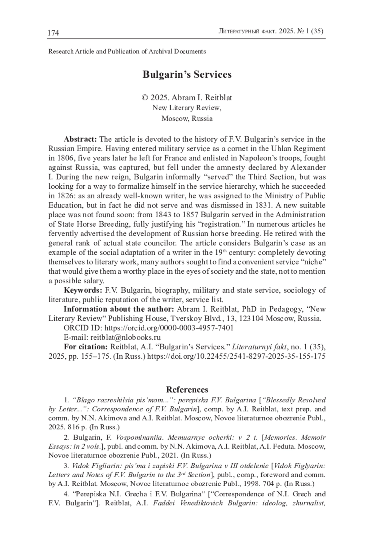 1. “Благо разрешился письмом.”.: переписка Ф.В. Булгарина / сост. А.И. Рейтблат; подгот. текста и коммент. Н.Н. Акимовой и А.И. Рейтблата. М.: НЛО, 2025. 816 с.