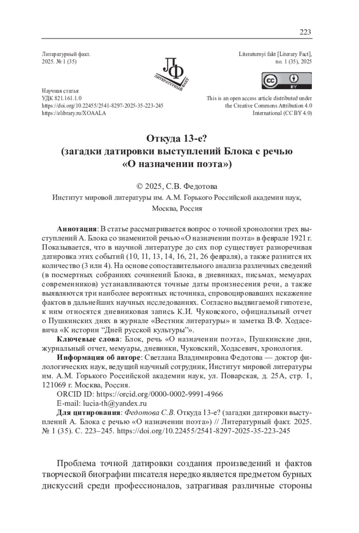 В статье рассматривается вопрос о точной хронологии трех выступлений А. Блока со знаменитой речью «О назначении поэта» в феврале 1921 г. Показывается, что в научной литературе до сих пор существует разноречивая датировка этих событий (10, 11, 13, 14, 16, 21, 26 февраля), а также разнится их количество (3 или 4). На основе сопоставительного анализа различных сведений (в посмертных собраниях сочинений Блока, в дневниках, письмах, мемуарах современников) устанавливаются точные даты произнесения речи, а также выявляются три наиболее вероятных источника, спровоцировавших искажение фактов в дальнейших научных исследованиях. Согласно выдвигаемой гипотезе, к ним относятся дневниковая запись К. И. Чуковского, официальный отчет о Пушкинских днях в журнале «Вестник литературы» и заметка В. Ф. Ходасевича «К истории “Дней русской культуры”».