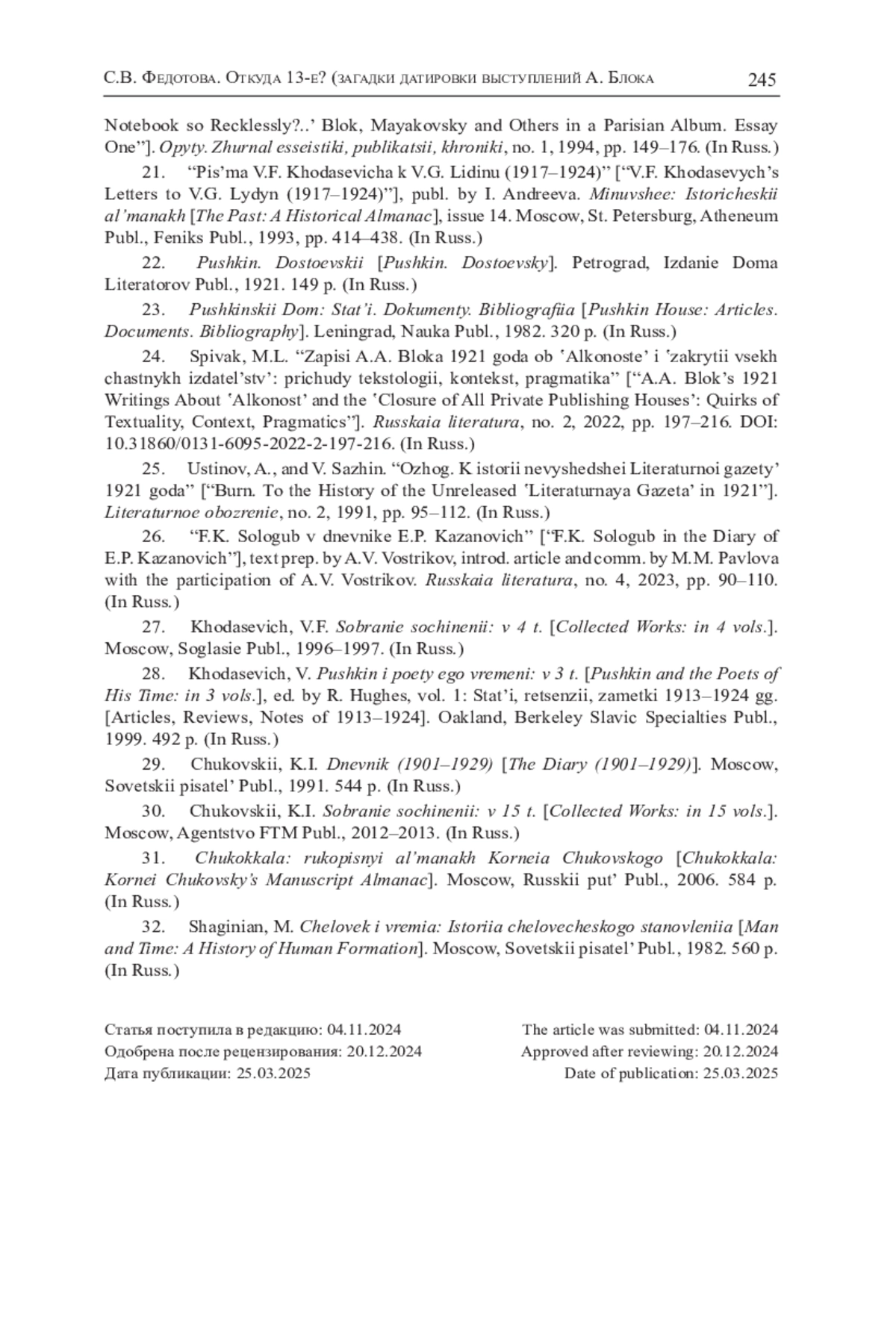 24. Спивак М.Л. Записи А.А. Блока 1921 года об “Алконосте” и “закрытии всех частных издательств”: причуды текстологии, контекст, прагматика // Русская литература. 2022. № 2. С. 197-216. DOI: 10.31860/0131-6095-2022-2-197-216 EDN: QWNOMD