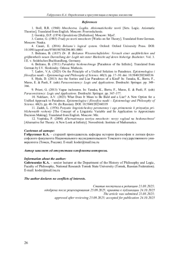 7. Ладов В.А. О принципе единого решения парадоксов // Эпистемология и философия науки. 2023. Т. 60, № 3. С. 17-30. DOI: 10.5840/202360336 EDN: IKXANR
