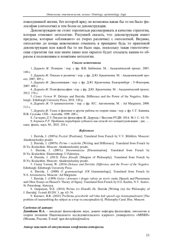 3. Деррида Ж. Диссеминация / пер. с фр. Д.Ю. Кралечкина. Екатеринбург: У-Фактория, 2007. 608 с. EDN: QWQSEX