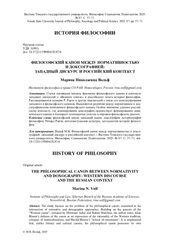 Статья посвящена анализу феномена философского канона в контексте западных дискуссий о «Великих книгах» и российского опыта истории философии. Рассматриваются позиции Р. Рорти и других мыслителей о типах его конструирования западного и философского канонов. Выделяются различия между нормативным и доксографическим пониманием философского канона. Особое внимание уделено российскому контексту, где доминирование доксографии препятствует формированию динамического канона и блокирует полноценное участие в мировом философском диалоге.