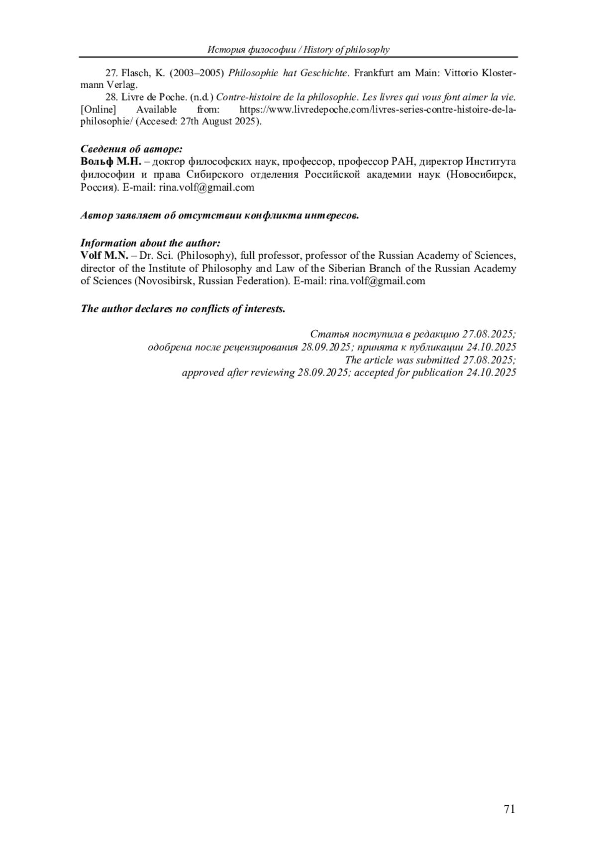 12. Вольф М.Н. Аналитическая история философии: как прошлое философии становится ее будущим // Историко-философский ежегодник. 2024. Т. 39. С. 305-336. EDN: TYFPUE