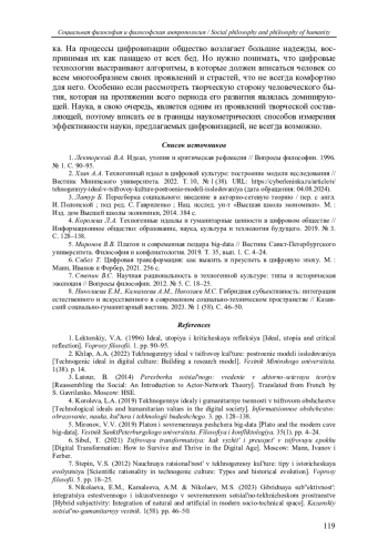 4. Королева Л.А. Техногенные идеалы и гуманитарные ценности в цифровом обществе // Информационное общество: образование, наука, культура и технологии будущего. 2019. № 3. С. 128-138. EDN: HYYJTM