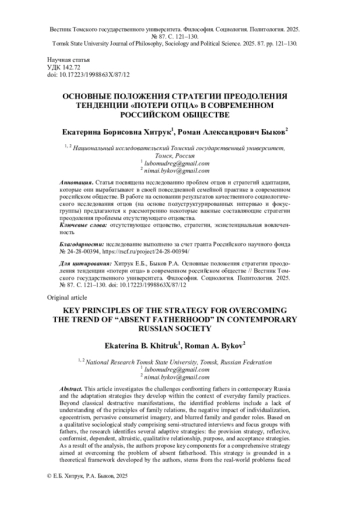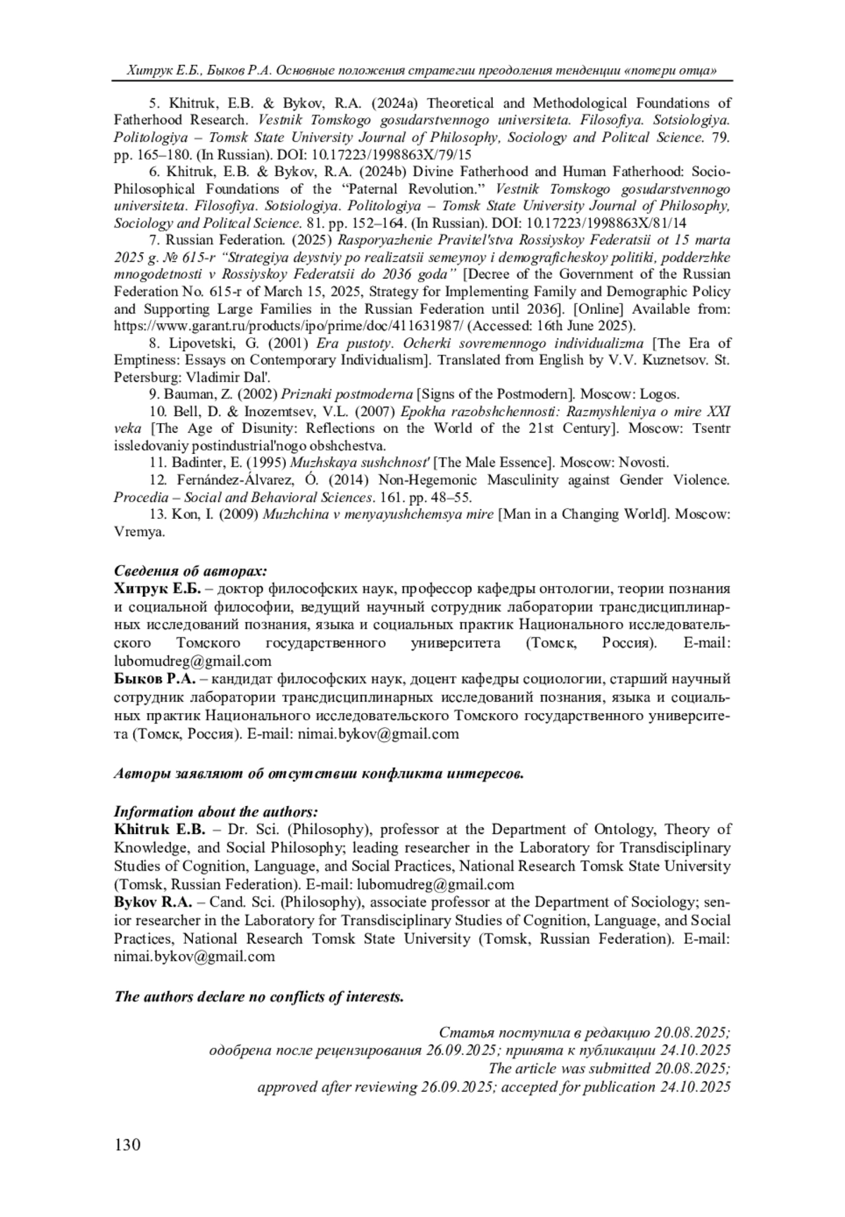 5. Хитрук Е.Б., Быков Р.А. Теоретико-методологические основания исследования отцовства // Вестник Томского государственного университета. Философия. Социология. Политология. 2024. № 79. С. 165-180. DOI: 10.17223/1998863X/79/15 EDN: NLXRNO
