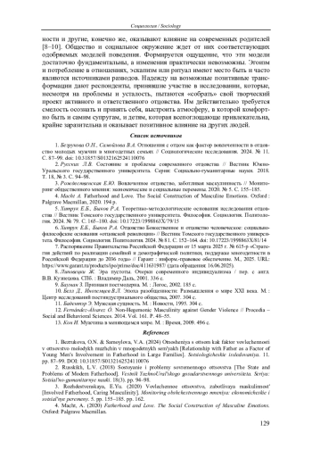 1. Безрукова О.Н., Самойлова В.А. Отношения с отцом как фактор вовлеченности в отцовство молодых мужчин в многодетных семьях // Социологические исследования. 2024. № 11. С. 87-99. DOI: 10.31857/S0132162524110076 EDN: SDAKYV