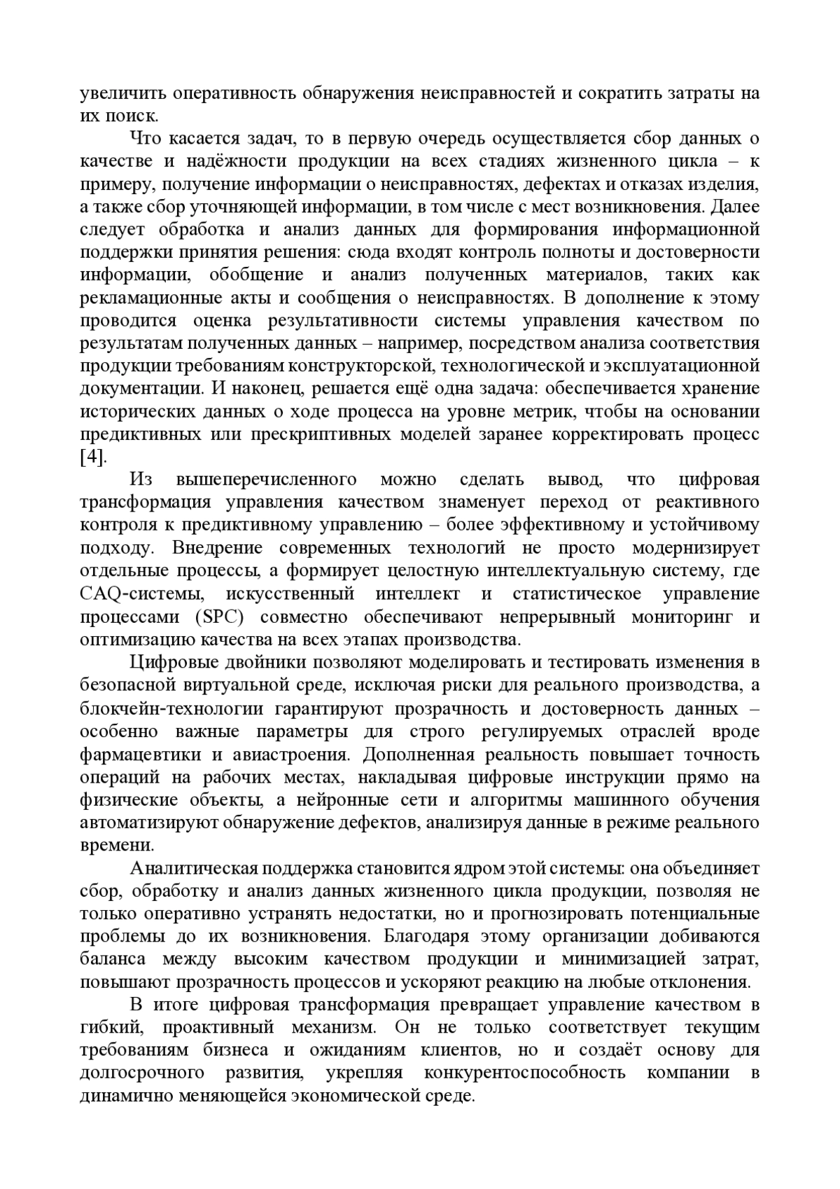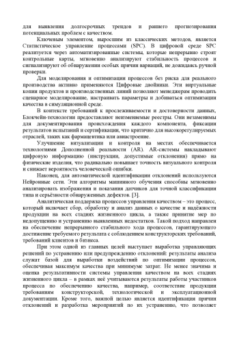 Цифровая трансформация управления качеством открывает переход от традиционного контроля к интеллектуальным предиктивным системам. Раскрыта роль CAQ‑систем, искусственного интеллекта, цифровых двойников, блокчейна и дополненной реальности в оптимизации производственных процессов. Показано, как автоматизация сбора и анализа данных повышает надёжность продукции, снижает влияние человеческого фактора и помогает достигать баланса между качеством и затратами на всех этапах жизненного цикла изделия.