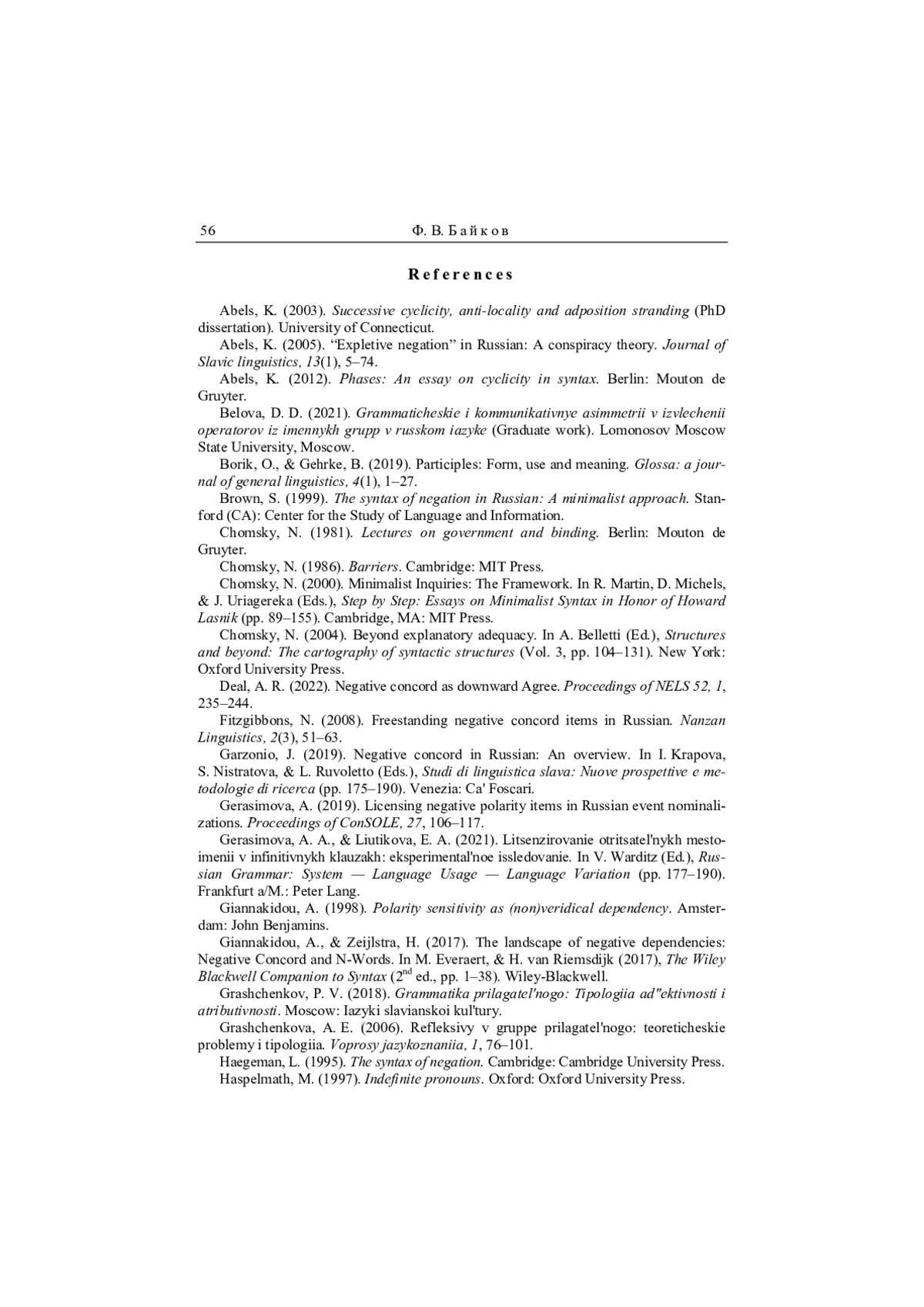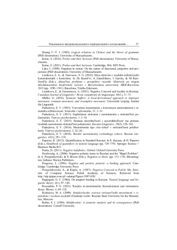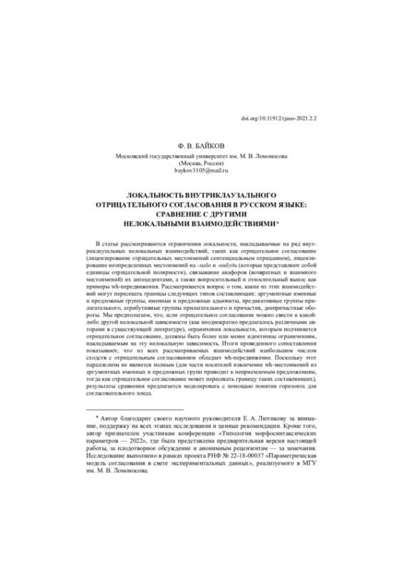 37. Lyutikova, Gerasimova 2023 - E. Lyutikova, A. Gerasimova. Negative Concord and locality in Russian // Canadian Journal of Linguistics/Revue canadienne de linguistique. 2023. Vol. 68, № 1. P. 31-73. EDN: TKSZNA