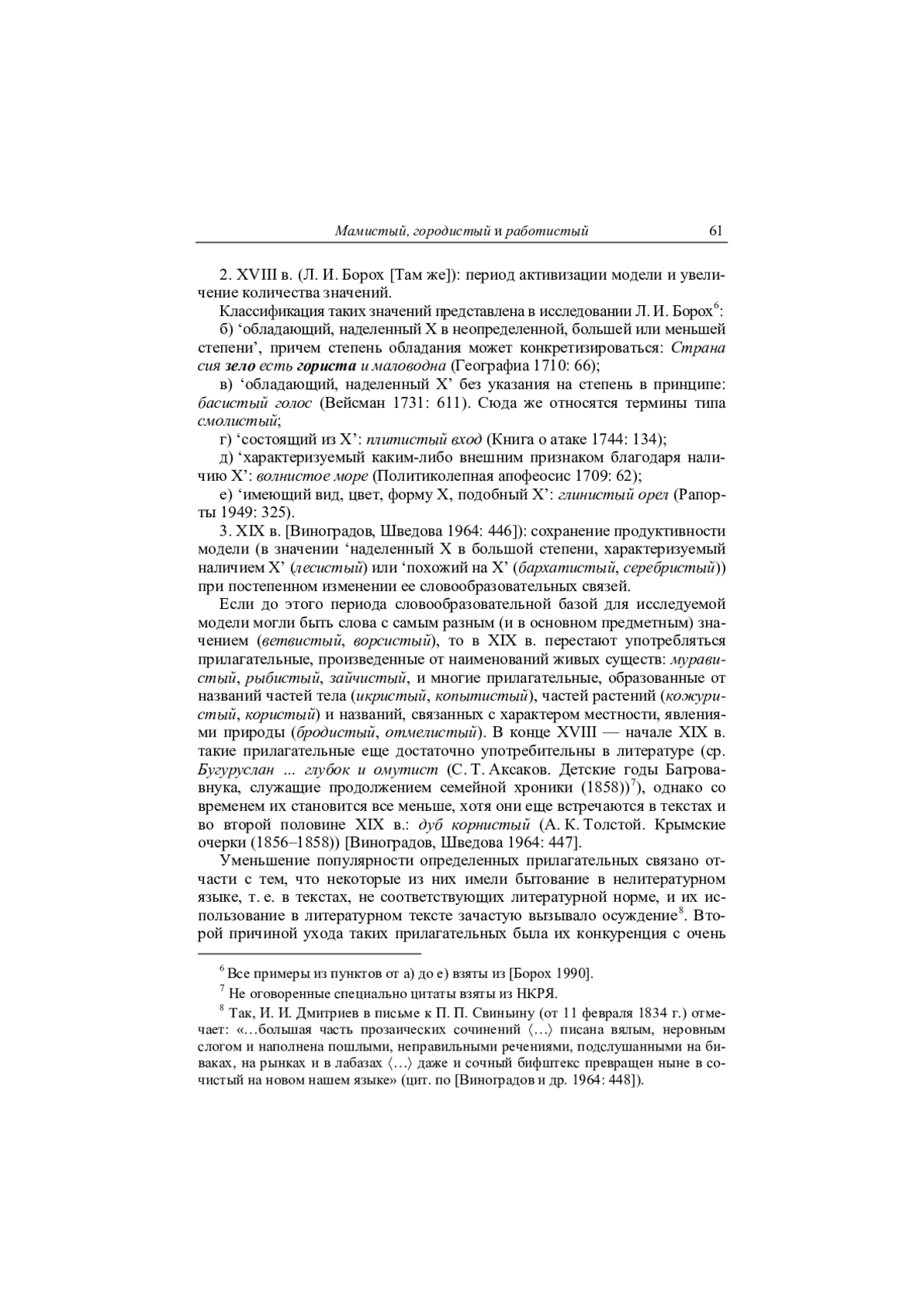 7. Борох 1990 - Л. И. Борох. Словообразовательные типы прилагательных с суффиксом -ист- в русских текстах первой половины XVIII в. // Русское языкознание. 1990. № 21. С.102-107.