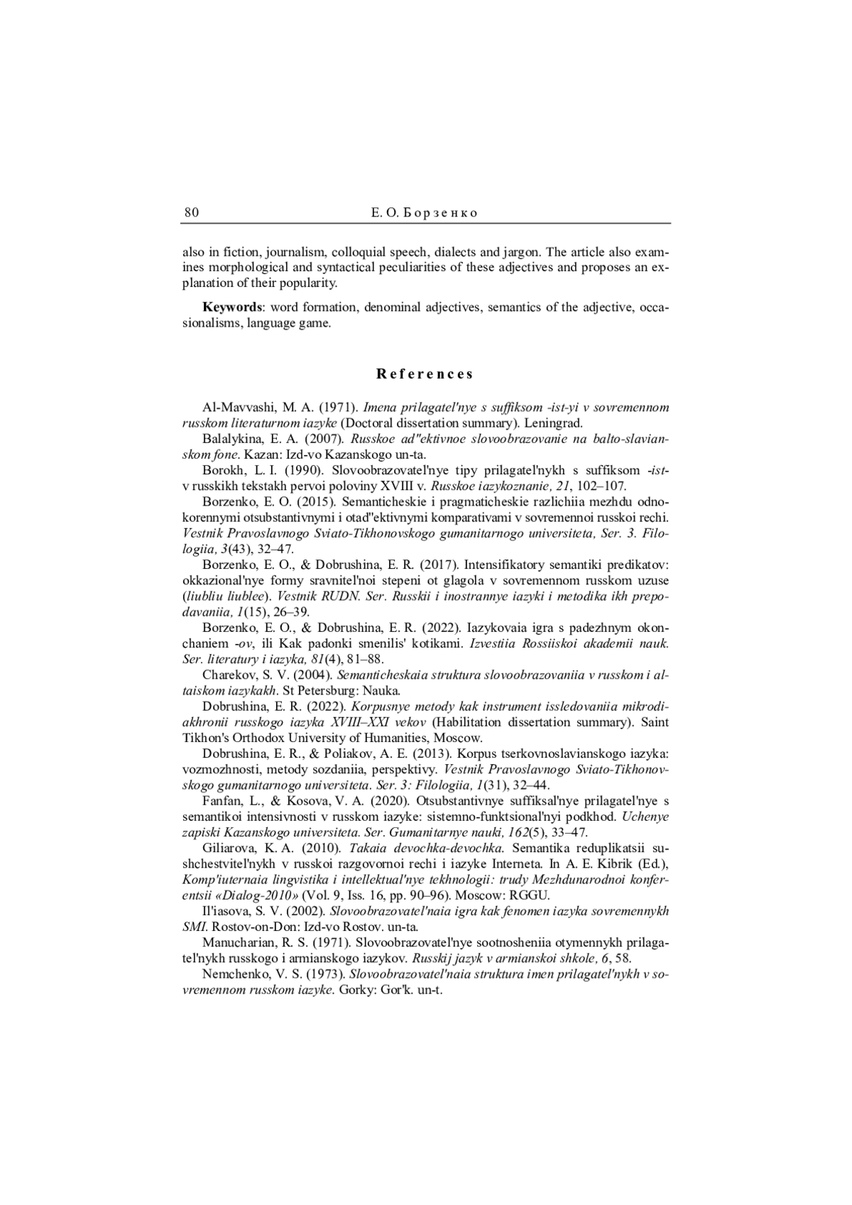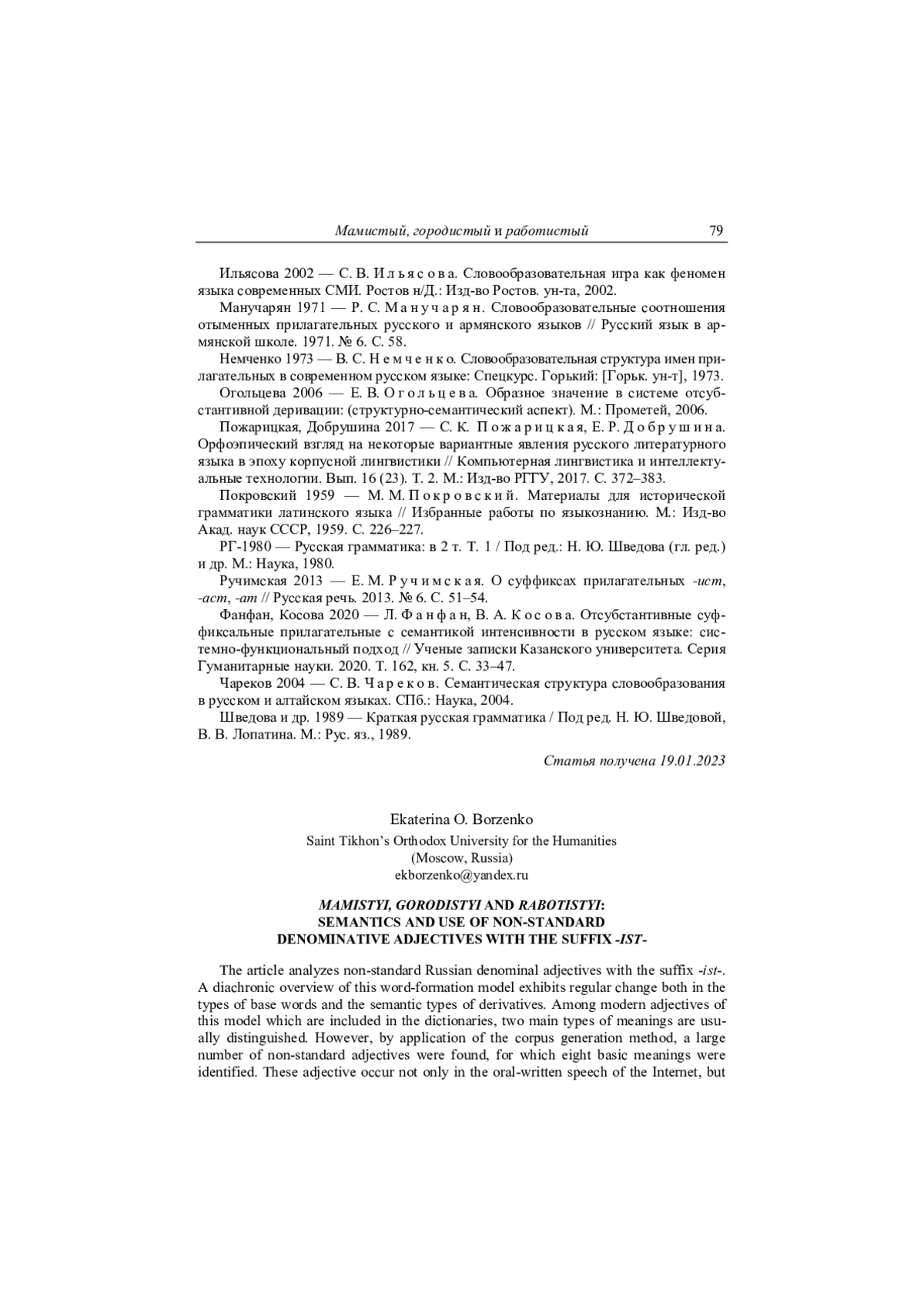 4. Борзенко 2015 - Е. О. Борзенко. Семантические и прагматические различия между однокоренными отсубстантивными и отадъективными компаративами в современной русской речи // Вестник ПСТГУ. Серия 3. Филология. 2015. № 3 (43). С. 32-47. EDN: UCKWHD