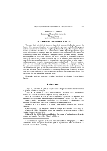 При стандартной модели согласования мишень копирует признаки рода, лица или числа контролера. Однако в некоторых случаях признаки мишени не могут быть вычислены однозначно. Тогда для контролера оказывается допустимо как морфологическое, так и семантическое согласование. На материале различных языков было замечено, что при атрибутивном согласовании более вероятной является морфологическая стратегия, а при предикативном — семантическая. Данное обобщение легло в основу Иерархии согласования Г. Корбетта. В статье рассматривается атрибутивное и предикативное согласование русских именных групп с сочиненными модификаторами. При расщепленной интерпретации данной конструкции существительное демонстрирует вариативность числа. Данные НКРЯ показывают, что для предикативного согласования оказывается возможным только мн. ч. глагола, что соответствует семантической стратегии при существительных ед. ч. и морфологической — при существительных мн. ч. Для изучения стратегий атрибутивного согласования премодификатора, характеризующего именную группу целиком, было проведено экспериментальное исследование. В качестве методики были выбраны оценка приемлемости по шкале Ликерта от 1 до 7 и чтение с саморегуляцией скорости. Результаты эксперимента показали, что для существительных во мн. ч. оказывается приемлемым как мн., так и ед. ч. премодификатора. Это обобщение соответствует Иерархии согласования. Поскольку для предикативного согласования возможна морфологическая стратегия, она должна быть возможна и для атрибутивного согласования. Для существительных в ед. ч. оказывается допустимой исключительно морфологическая стратегия, но не семантическая. Этот факт также объясняется Иерархией согласования: возможность семантического предикативного согласования не имплицирует возможность семантического атрибутивного согласования, поскольку для атрибутивного согласования типологически более характерна морфологическая стратегия. Следовательно, данные о согласовании именных групп с сочиненными модификаторами подтверждают типологическую картину относительно выбора стратегий согласования при неоднозначном вычислении признаков контролера