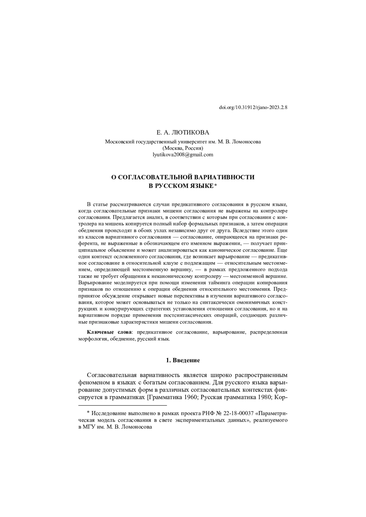 12. Лютикова 2015 - Е. А. Лютикова. Согласование, признаки и структура именной группы в русском языке // Русский язык в научном освещении. 2015. № 30 (1). С. 44-74. EDN: VPMKND