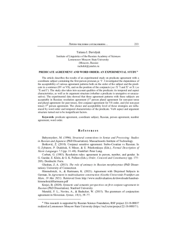 Статья описывает результаты экспериментального исследования, посвященного предикативному согласованию с сочиненным подлежащим, одним из конъюнктов которого выступает личное местоимение я. Целью исследования стало выявление зависимости приемлемости различных вариантов согласования как от порядка следования подлежащего и сказуемого в предложении (SV или VS), так и от взаимного расположения конъюнктов относительно друг друга (я и Х, Х и я). В исследуемые факторы были включены также свойства предиката: его временны́ е и видовые характеристики, а также тип аргументной структуры (является предикат неаккузативным или неэргативным). Данные экспериментов показали, что в русском языке с исследуемым типом сочиненного подлежащего приемлемы три стратегии согласования: согласование по правилам разрешения (для непрошедшего времени — согласование по 1-му лицу мн. ч., для прошедшего времени — согласование по мн. ч.), согласование с первым конъюнктом при порядке слов VS и (для предикатов в непрошедшем времени) согласование по 3-му лицу мн. ч. На выбор и уровень приемлемости перечисленных стратегий влияют факторы порядка слов и временнóй характеристики предиката. Глагольный вид и аргументная структура предиката оказались незначимыми факторами