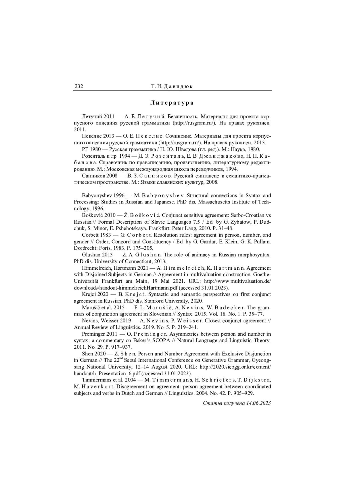 9. Glushan 2013 - Z. A. Glushan. The role of animacy in Russian morphosyntax. PhD dis. University of Connecticut, 2013.