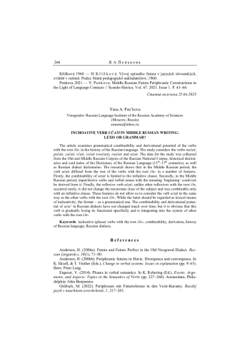 22. Penkova 2021 - Y. Penkova. Middle Russian Future Periphrastic Constructions in the Light of Language Contacts // Scando-Slavica. Vol. 67. 2021. Issue 1. P. 43-64. EDN: NCNHTB
